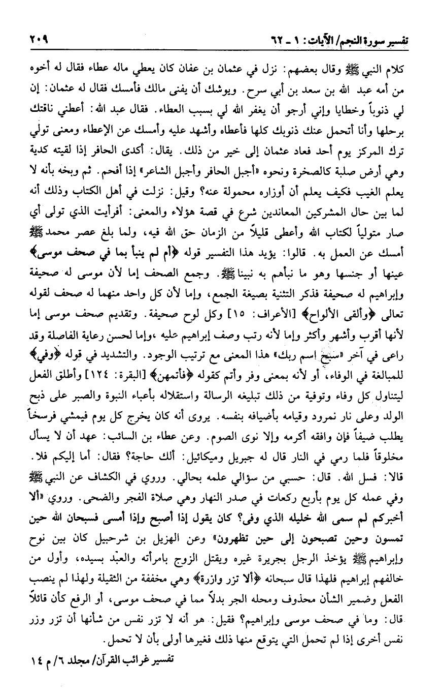 وقال بعضهم: نزل في عثمان بن عفان كان يعطي ماله عطاء فقال له أخوه من أمه عبد الله بن سعد بن أبي سرح. ويوشك أن يفنى مالك فأمسك فقال له عثمان: إن لي ذنوبا وخطايا وإني أرجو أن يغفر الله لي بسبب العطاء. فقال عبد الله: أعطني ناقتك برحلها وأنا أتحمل عنك ذنوبك كلها فأعطاه وأشهد عليه وأمسك عن الإعطاء ومعنى تولي ترك المركز يوم أحد فعاد عثمان إلى خير من ذلك. يقال: أكدى الحافر إذا لقيته كدية وهي أرض صلبة كالصخرة ونحوه «أجبل الحافر وأجبل الشاعر» إذا أفحم. ثم وبخه بأنه لا يعلم الغيب فكيف يعلم أن أوزاره محمولة عنه؟ وقيل: نزلت في أهل الكتاب وذلك أنه لما بين حال المشركين المعاندين شرع في قصة هؤلاء والمعنى: أفرأيت الذي تولى أي صار متوليا لكتاب الله وأعطى قليلا من الزمان حق الله فيه، ولما بلغ عصر محمد صلى الله عليه وسلم أمسك عن العمل به. قالوا: يؤيد هذا التفسير قوله أَمْ لَمْ يُنَبَّأْ بِما فِي صُحُفِ مُوسى عينها أو جنسها وهو ما نبأهم به نبينا صلى الله عليه وسلم. وجمع الصحف إما لأن موسى له صحيفة وإبراهيم له صحيفة فذكر التثنية بصيغة الجمع، وإما لأن كل واحد منهما له صحف لقوله تعالى وَأَلْقَى الْأَلْواحَ [الأعراف: 15] وكل لوح صحيفة. وتقديم صحف موسى إما لأنها أقرب وأشهر وأكثر وإما لأنه رتب وصف إبراهيم عليه، وإما لحسن رعاية الفاصلة وقد راعى في آخر «سبح اسم ربك» هذا المعنى مع ترتيب الوجود. والتشديد في قوله وَفَّى للمبالغة في الوفاء، أو لأنه بمعنى وفر وأتم كقوله فَأَتَمَّهُنَّ [البقرة: 124] وأطلق الفعل ليتناول كل وفاء وتوفية من ذلك تبليغه الرسالة واستقلاله بأعباء النبوة والصبر على ذبح الولد وعلى نار نمرود وقيامه بأضيافه بنفسه.