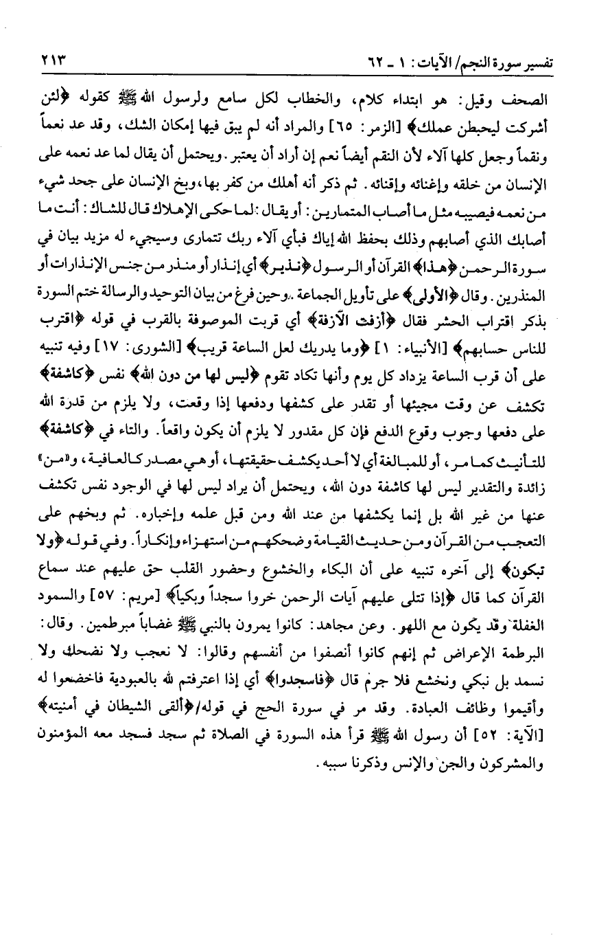 الصحف وقيل: هو ابتداء كلام، والخطاب لكل سامع ولرسول الله صلى الله عليه وسلم كقوله لَئِنْ أَشْرَكْتَ لَيَحْبَطَنَّ عَمَلُكَ [الزمر: 65] والمراد أنه لم يبق فيها إمكان الشك، وقد عد نعما ونقما وجعل كلها آلاء لأن النقم أيضا نعم إن أراد أن يعتبر. ويحتمل أن يقال لما عد نعمه على الإنسان من خلقه وإغنائه وإقنائه. ثم ذكر أنه أهلك من كفر بها، وبخ الإنسان على جحد شيء من نعمه فيصيبه مثل ما أصاب المتمارين: أو يقال: لما حكى الإهلاك قال للشاك: أنت ما أصابك الذي أصابهم وذلك بحفظ الله إياك فبأي آلاء ربك تتمارى وسيجيء له مزيد بيان في سورة الرحمن هذا القرآن أو الرسول نَذِيرٌ أي إنذار أو منذر من جنس الإنذارات أو المنذرين. وقال الْأُولى على تأويل الجماعة. وحين فرغ من بيان التوحيد والرسالة ختم السورة بذكر اقتراب الحشر فقال أَزِفَتِ الْآزِفَةُ أي قربت الموصوفة بالقرب في قوله اقْتَرَبَ لِلنَّاسِ حِسابُهُمْ [الأنبياء: 1] وَما يُدْرِيكَ لَعَلَّ السَّاعَةَ قَرِيبٌ [الشورى: 17] وفيه تنبيه على أن قرب الساعة يزداد كل يوم وأنها تكاد تقوم لَيْسَ لَها مِنْ دُونِ اللَّهِ نفس كاشِفَةٌ للتأنيث كما مر، أو للمبالغة أي لا أحد يكشف حقيقتها، أو هي مصدر كالعافية، و «من» زائدة والتقدير ليس لها كاشفة دون الله، ويحتمل أن يراد ليس لها في الوجود نفس تكشف عنها من غير الله بل إنما يكشفها من عند الله ومن قبل علمه وإخباره. ثم وبخهم على التعجب من القرآن ومن حديث القيامة وضحكهم من استهزاء وإنكارا. وفي قوله وَلا تَبْكُونَ إلى آخره تنبيه على أن البكاء والخشوع وحضور القلب حق عليهم عند سماع القرآن كما قال إِذا تُتْلى عَلَيْهِمْ آياتُ الرَّحْمنِ خَرُّوا سُجَّداً وَبُكِيًّا [مريم: 57] والسمود الغفلة وقد يكون مع اللهو. وعن مجاهد: كانوا يمرون بالنبي صلى الله عليه وسلم غضابا مبرطمين. وقال: