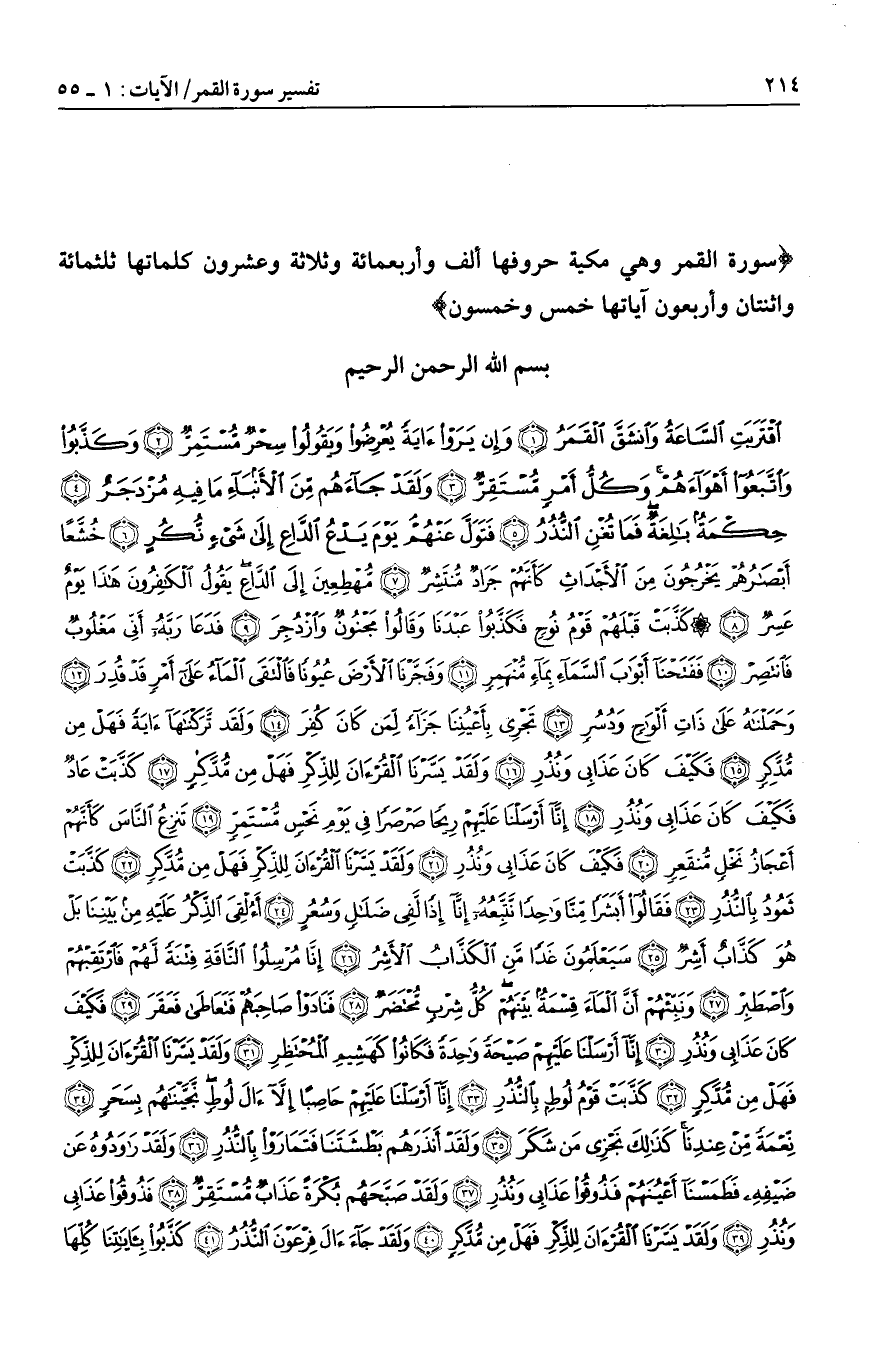 اقْتَرَبَتِ السَّاعَةُ وَانْشَقَّ الْقَمَرُ (1) وَإِنْ يَرَوْا آيَةً يُعْرِضُوا وَيَقُولُوا سِحْرٌ مُسْتَمِرٌّ (2) وَكَذَّبُوا وَاتَّبَعُوا أَهْواءَهُمْ وَكُلُّ أَمْرٍ مُسْتَقِرٌّ (3) وَلَقَدْ جاءَهُمْ مِنَ الْأَنْباءِ ما فِيهِ مُزْدَجَرٌ (4)