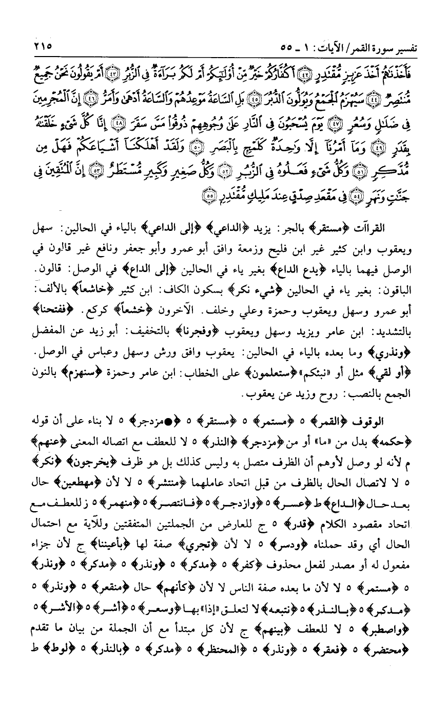 الْقَمَرُ هـ مُسْتَمِرٌّ هـ مُسْتَقِرٌّ هـ مُزْدَجَرٌ هـ لا بناء على أن قوله حِكْمَةٌ بدل من «ما» أو من مُزْدَجَرٌ النُّذُرُ هـ لا للعطف مع اتصاله المعنى عَنْهُمْ م لأنه لو وصل لأوهم أن الظرف متصل به وليس كذلك بل هو ظرف يَخْرُجُونَ نُكُرٍ هـ لا لاتصال الحال بالظرف من قبل اتحاد عاملهما مُنْتَشِرٌ هـ لا لأن مُهْطِعِينَ حال بعد حال الدَّاعِ ط عَسِرٌ هـ وَازْدُجِرَ هـ فَانْتَصِرْ هـ مُنْهَمِرٍ هـ ز للعطف مع اتحاد مقصود الكلام قُدِرَ هـ ج للعارض من الجملتين المتفقتين وللآية مع احتمال الحال أي وقد حملناه وَدُسُرٍ هـ لا لأن تَجْرِي صفة لها بِأَعْيُنِنا ج لأن جزاء مفعول له أو مصدر لفعل محذوف كُفِرَ هـ مُدَّكِرٍ هـ وَنُذُرِ هـ مُدَّكِرٍ هـ وَنُذُرِ هـ مُسْتَمِرٍّ هـ لا لأن ما بعده صفة الناس لا لأن كَأَنَّهُمْ حال مُنْقَعِرٍ هـ وَنُذُرِ هـ مُدَّكِرٍ هـ بِالنُّذُرِ هـ نَتَّبِعُهُ لا لتعلق «إذا» بها وَسُعُرٍ هـ أَشِرٌ هـ الْأَشِرُ هـ وَاصْطَبِرْ هـ لا للعطف بَيْنَهُمْ ج لأن كل مبتدأ مع أن الجملة من بيان ما تقدم مُحْتَضَرٌ هـ فَعَقَرَ هـ وَنُذُرِ هـ الْمُحْتَظِرِ هـ مُدَّكِرٍ هـ بِالنُّذُرِ هـ لُوطٍ ط