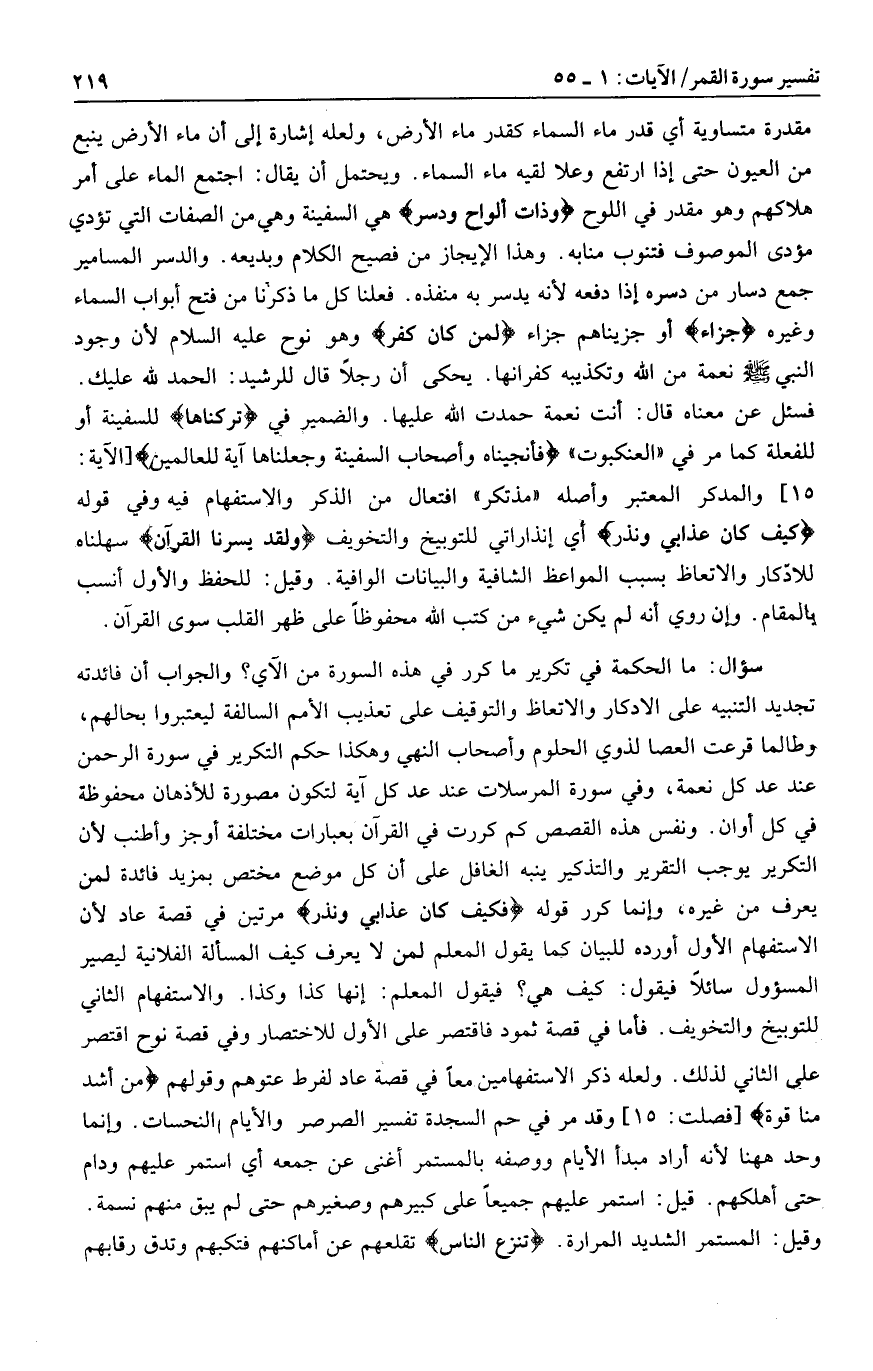 سؤال: ما الحكمة في تكرير ما كرر في هذه السورة من الآي؟ والجواب أن فائدته تجديد التنبيه على الادكار والاتعاظ والتوقيف على تعذيب الأمم السالفة ليعتبروا بحالهم، وطالما قرعت العصا لذوي الحلوم وأصحاب النهي وهكذا حكم التكرير في سورة الرحمن عند عد كل نعمة، وفي سورة المرسلات عند عد كل آية لتكون مصورة للأذهان محفوظة في كل أوان. ونفس هذه القصص كم كررت في القرآن بعبارات مختلفة أوجز وأطنب لأن التكرير يوجب التقرير والتذكير ينبه الغافل على أن كل موضع مختص بمزيد فائدة لمن يعرف من غيره، وإنما كرر قوله فَكَيْفَ كانَ عَذابِي وَنُذُرِ مرتين في قصة عاد لأن الاستفهام الأول أورده للبيان كما يقول المعلم لمن لا يعرف كيف المسألة الفلانية ليصير المسئول سائلا فيقول: كيف هي؟ فيقول المعلم: إنها كذا وكذا. والاستفهام الثاني للتوبيخ والتخويف. فأما في قصة ثمود فاقتصر على الأول للاختصار وفي قصة نوح اقتصر على الثاني لذلك. ولعله ذكر الاستفهامين معا في قصة عاد لفرط عتوهم وقولهم مَنْ أَشَدُّ مِنَّا قُوَّةً [فصلت: 15] وقد مر في حم السجدة تفسير الصرصر والأيام النحسات. وإنما وحد هاهنا لأنه أراد مبدأ الأيام ووصفه بالمستمر أغنى عن جمعه أي استمر عليهم ودام حتى أهلكهم. قيل: استمر عليهم جميعا على كبيرهم وصغيرهم حتى لم يبق منهم نسمة.