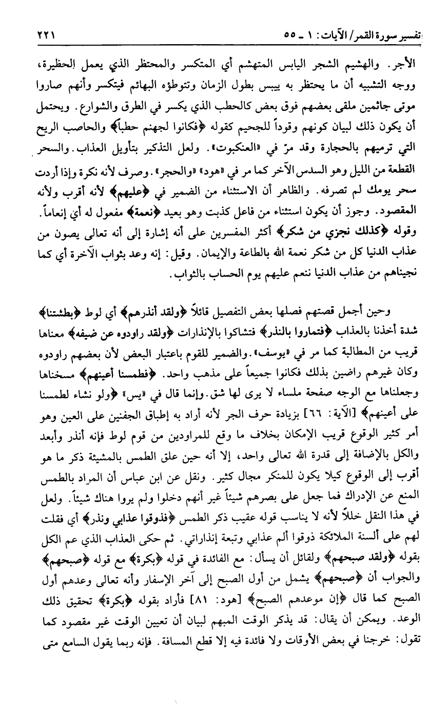 وحين أجمل قصتهم فصلها بعض التفصيل قائلا وَلَقَدْ أَنْذَرَهُمْ أي لوط بَطْشَتَنا شدة أخذنا بالعذاب فَتَمارَوْا بِالنُّذُرِ فتشاكوا بالإنذارات وَلَقَدْ راوَدُوهُ عَنْ ضَيْفِهِ معناها قريب من المطالبة كما مر في «يوسف» . والضمير للقوم باعتبار البعض لأن بعضهم راودوه وكان غيرهم راضين بذلك فكانوا جميعا على مذهب واحد. فَطَمَسْنا أَعْيُنَهُمْ مسخناها وجعلناها مع الوجه صفحة ملساء لا يرى لها شق. وإنما قال في «يس» وَلَوْ نَشاءُ لَطَمَسْنا عَلى أَعْيُنِهِمْ [الآية: 66] بزيادة حرف الجر لأنه أراد به إطباق الجفنين على العين وهو أمر كثير الوقوع قريب الإمكان بخلاف ما وقع للمراودين من قوم لوط فإنه أنذر وأبعد والكل بالإضافة إلى قدرة الله تعالى واحد، إلا أنه حين علق الطمس بالمشيئة ذكر ما هو أقرب إلى الوقوع كيلا يكون للمنكر مجال كثير. ونقل عن ابن عباس أن المراد بالطمس المنع عن الإدراك فما جعل على بصرهم شيئا غير أنهم دخلوا ولم يروا هناك شيئا. ولعل في هذا النقل خللا لأنه لا يناسب قوله عقيب ذكر الطمس فَذُوقُوا عَذابِي وَنُذُرِ أي فقلت لهم على ألسنة الملائكة ذوقوا ألم عذابي وتبعة إنذاراتي. ثم حكى العذاب الذي عم الكل بقوله وَلَقَدْ صَبَّحَهُمْ ولقائل أن يسأل: مع الفائدة في قوله بُكْرَةً مع قوله صَبَّحَهُمْ والجواب أن صَبَّحَهُمْ يشمل من أول الصبح إلى آخر الإسفار وأنه تعالى وعدهم أول الصبح كما قال إِنَّ مَوْعِدَهُمُ الصُّبْحُ [هود: 81] فأراد بقوله بُكْرَةً تحقيق ذلك الوعد. ويمكن أن يقال: قد يذكر الوقت المبهم لبيان أن تعيين الوقت غير مقصود كما تقول: خرجنا في بعض الأوقات ولا فائدة فيه إلا قطع المسافة. فإنه ربما يقول السامع متى