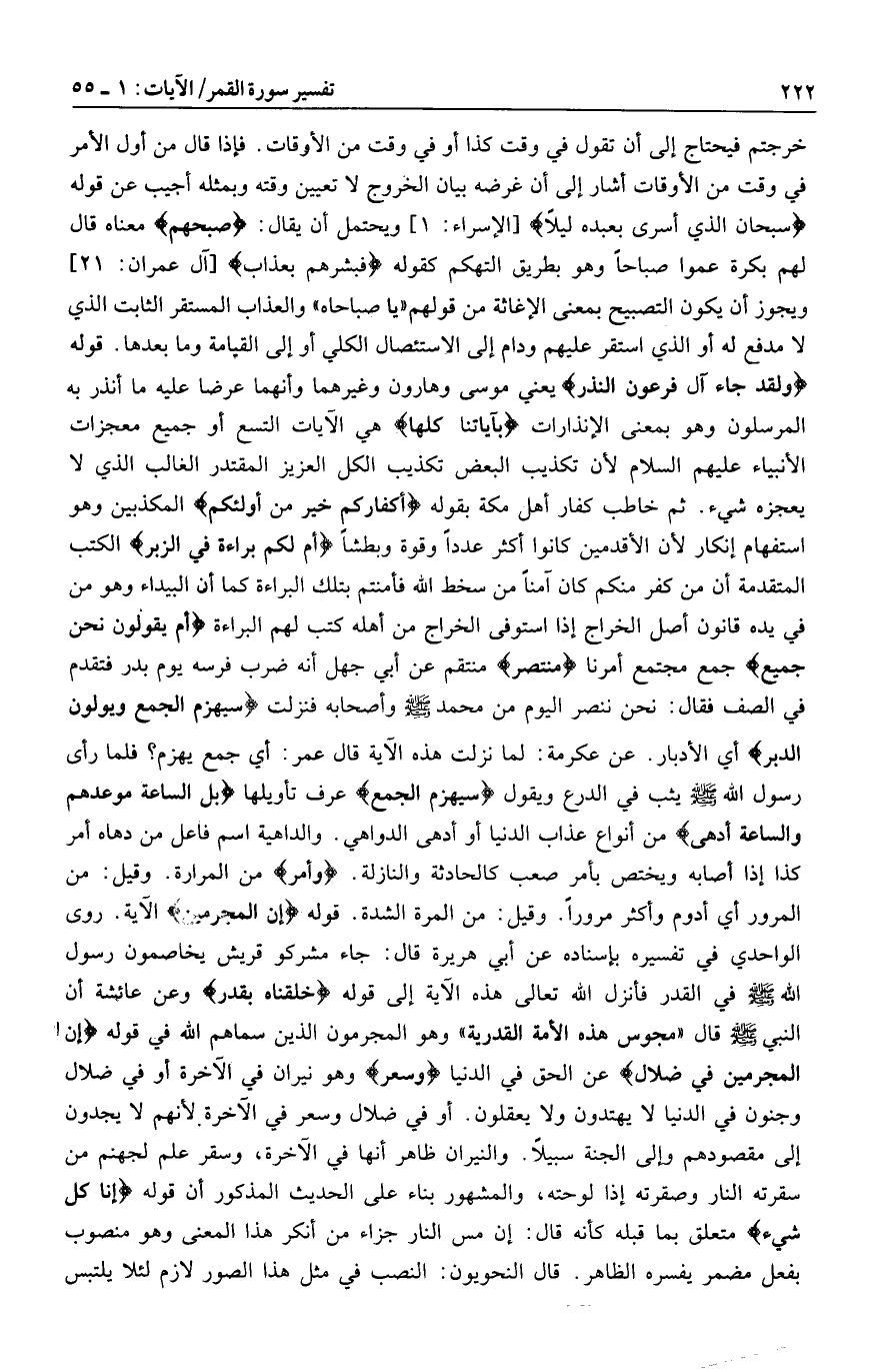 خرجتم فيحتاج إلى أن تقول في وقت كذا أو في وقت من الأوقات. فإذا قال من أول الأمر في وقت من الأوقات أشار إلى أن غرضه بيان الخروج لا تعيين وقته وبمثله أجيب عن قوله سُبْحانَ الَّذِي أَسْرى بِعَبْدِهِ لَيْلًا [الإسراء: 1] ويحتمل أن يقال: صَبَّحَهُمْ معناه قال لهم بكرة عموا صباحا وهو بطريق التهكم كقوله فَبَشِّرْهُمْ بِعَذابٍ [آل عمران: 21] ويجوز أن يكون التصبيح بمعنى الإغاثة من قولهم «يا صباحاه» والعذاب المستقر الثابت الذي لا مدفع له أو الذي استقر عليهم ودام إلى الاستئصال الكلي أو إلى القيامة وما بعدها. قوله وَلَقَدْ جاءَ آلَ فِرْعَوْنَ النُّذُرُ يعني موسى وهارون وغيرهما وأنهما عرضا عليه ما أنذر به المرسلون وهو بمعنى الإنذارات بِآياتِنا كُلِّها هي الآيات التسع أو جميع معجزات الأنبياء عليهم السلام لأن تكذيب البعض تكذيب الكل العزيز المقتدر الغالب الذي لا يعجزه شيء. ثم خاطب كفار أهل مكة بقوله أَكُفَّارُكُمْ خَيْرٌ مِنْ أُولئِكُمْ المكذبين وهو استفهام إنكار لأن الأقدمين كانوا أكثر عددا وقوة وبطشا أَمْ لَكُمْ بَراءَةٌ فِي الزُّبُرِ الكتب المتقدمة أن من كفر منكم كان آمنا من سخط الله فأمنتم بتلك البراءة كما أن البيداء وهو من في يده قانون أصل الخراج إذا استوفى الخراج من أهله كتب لهم البراءة أَمْ يَقُولُونَ نَحْنُ جَمِيعٌ جمع مجتمع أمرنا مُنْتَصِرٌ منتقم عن أبي جهل أنه ضرب فرسه يوم بدر فتقدم في الصف فقال: نحن ننصر اليوم من محمد صلى الله عليه وسلم وأصحابه فنزلت سَيُهْزَمُ الْجَمْعُ وَيُوَلُّونَ الدُّبُرَ أي الأدبار. عن عكرمة: لما نزلت هذه الآية قال عمر: أي جمع يهزم؟ فلما رأى رسول الله صلى الله عليه وسلم يثب في الدرع ويقول سَيُهْزَمُ الْجَمْعُ عرف تأويلها بَلِ السَّاعَةُ مَوْعِدُهُمْ وَالسَّاعَةُ أَدْهى من أنواع عذاب الدنيا أو أدهى الدواهي. والداهية اسم فاعل من دهاه أمر كذا إذا أصابه ويختص بأمر صعب كالحادثة والنازلة. وَأَمَرُّ من المرارة. وقيل: من المرور أي أدوم وأكثر مرورا. وقيل: من المرة الشدة. قوله إِنَّ الْمُجْرِمِينَ الآية.