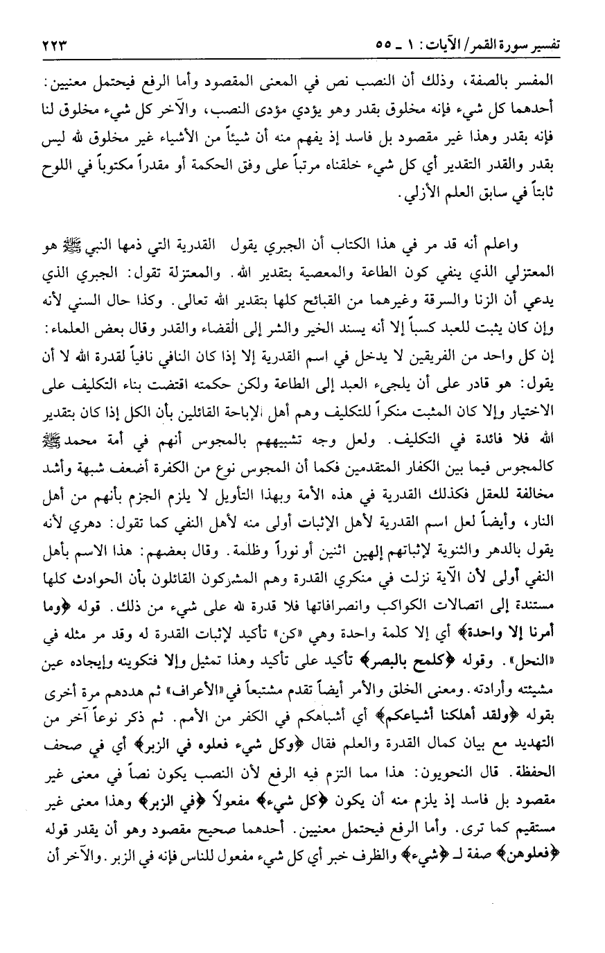إن كل واحد من الفريقين لا يدخل في اسم القدرية إلا إذا كان النافي نافيا لقدرة الله لا أن يقول: هو قادر على أن يجلىء العبد إلى الطاعة ولكن حكمته اقتضت بناء التكليف على الاختيار وإلا كان المثبت منكرا للتكليف وهم أهل الإباحة القائلين بأن الكل إذا كان بتقدير الله فلا فائدة في التكليف. ولعل وجه تشبيههم بالمجوس أنهم في أمة محمد صلى الله عليه وسلم كالمجوس فيما بين الكفار المتقدمين فكما أن المجوس نوع من الكفرة أضعف شبهة وأشد مخالفة للعقل فكذلك القدرية في هذه الأمة وبهذا التأويل لا يلزم الجزم بأنهم من أهل النار، وأيضا لعل اسم القدرية لأهل الإثبات أولى منه لأهل النفي كما تقول: دهري لأنه يقول بالدهر والثنوية لإثباتهم إلهين اثنين أو نورا وظلمة. وقال بعضهم: هذا الاسم بأهل النفي أولى لأن الآية نزلت في منكري القدرة وهم المشركون القائلون بأن الحوادث كلها مستندة إلى اتصالات الكواكب وانصرافاتها فلا قدرة لله على شيء من ذلك. قوله وَما أَمْرُنا إِلَّا واحِدَةٌ أي إلا كلمة واحدة وهي «كن» تأكيد لإثبات القدرة له وقد مر مثله في «النحل» . وقوله كَلَمْحٍ بِالْبَصَرِ تأكيد على تأكيد وهذا تمثيل وإلا فتكوينه وإيجاده عين مشيئته وأرادته. ومعنى الخلق والأمر أيضا تقدم مشتبعا في «الأعراف» ثم هددهم مرة أخرى بقوله وَلَقَدْ أَهْلَكْنا أَشْياعَكُمْ أي أشباهكم في الكفر من الأمم. ثم ذكر نوعا آخر من التهديد مع بيان كمال القدرة والعلم فقال وَكُلُّ شَيْءٍ فَعَلُوهُ فِي الزُّبُرِ أي في صحف الحفظة. قال النحويون: هذا مما التزم فيه الرفع لأن النصب يكون نصا في معنى غير مقصود بل فاسد إذ يلزم منه أن يكون كُلُّ شَيْءٍ مفعولا فِي الزُّبُرِ وهذا معنى غير مستقيم كما ترى. وأما الرفع فيحتمل معنيين. أحدهما صحيح مقصود وهو أن يقدر قوله فعلوهن صفة ل شَيْءٍ والظرف خبر أي كل شيء مفعول للناس فإنه في الزبر. والآخر أن