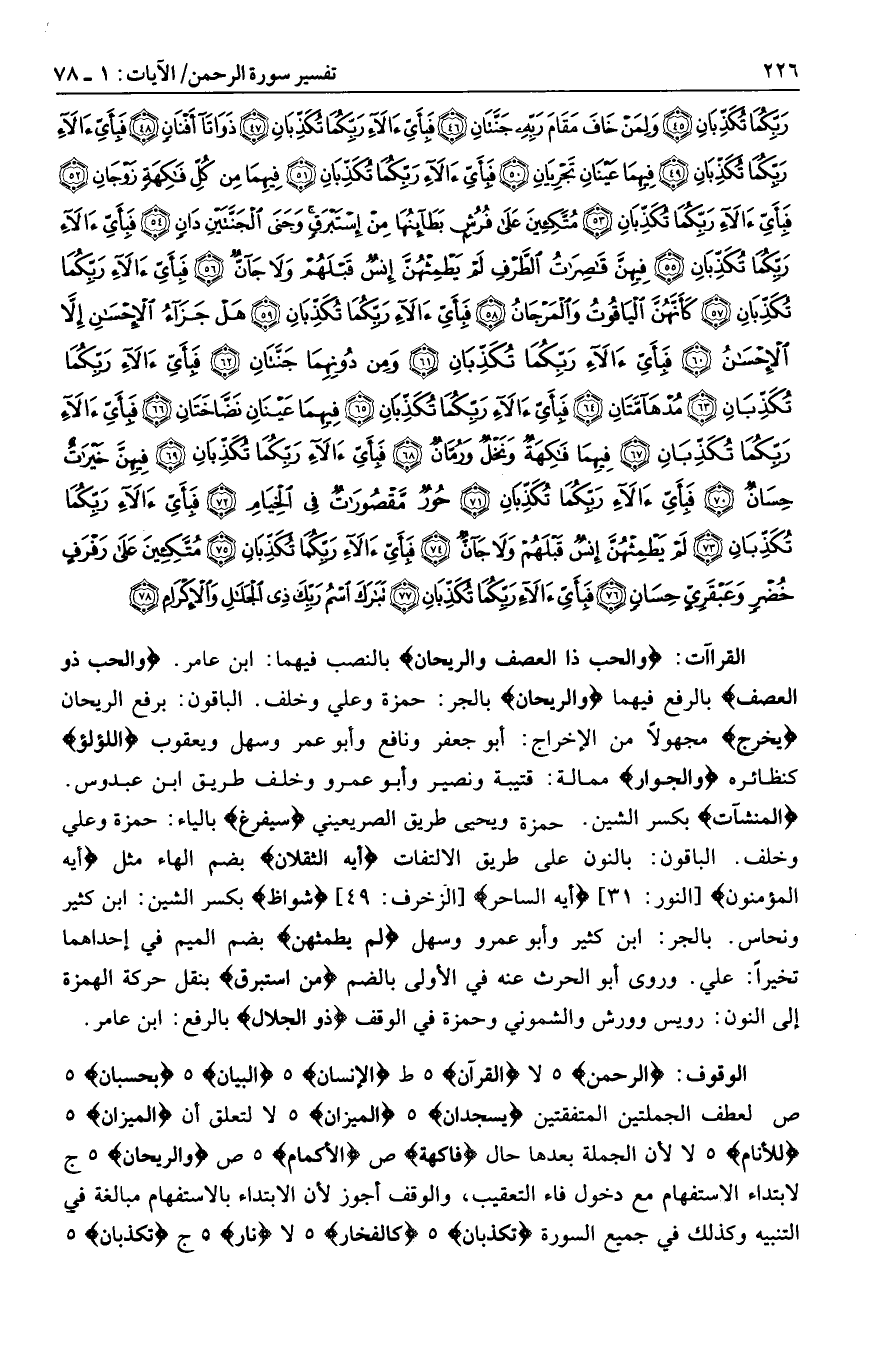 الرَّحْمنُ هـ لا الْقُرْآنَ هـ ط الْإِنْسانَ هـ الْبَيانَ هـ بِحُسْبانٍ هـ ص لعطف الجملتين المتفقتين يَسْجُدانِ هـ الْمِيزانَ هـ لا لتعلق أن الْمِيزانِ هـ لِلْأَنامِ هـ لا لأن الجملة بعدها حال فاكِهَةٌ ص الْأَكْمامِ هـ ص وَالرَّيْحانُ هـ ج لابتداء الاستفهام مع دخول فاء التعقيب، والوقف أجوز لأن الابتداء بالاستفهام مبالغة في التنبيه وكذلك في جميع السورة تُكَذِّبانِ هـ كَالْفَخَّارِ هـ لا نارٍ هـ ج تُكَذِّبانِ هـ