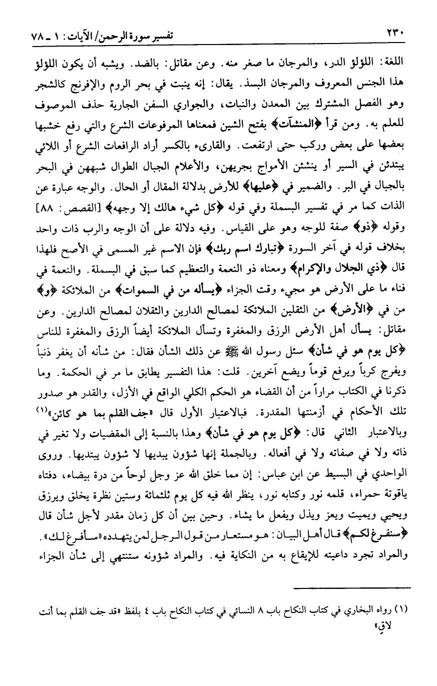 اللغة: اللؤلؤ الدر، والمرجان ما صغر منه. وعن مقاتل: بالضد. ويشبه أن يكون اللؤلؤ هذا الجنس المعروف والمرجان البسذ. يقال: إنه ينبت في بحر الروم والإفرنج كالشجر وهو الفصل المشترك بين المعدن والنبات، والجواري السفن الجارية حذف الموصوف للعلم به. ومن قرأ الْمُنْشَآتُ بفتح الشين فمعناها المرفوعات الشرع والتي رفع خشبها بعضها على بعض وركب حتى ارتفعت. والقارئ بالكسر أراد الرافعات الشرع أو اللائي يبتدئن في السير أو ينشئن الأمواج بجريهن، والأعلام الجبال الطوال شبههن في البحر بالجبال في البر. والضمير في عَلَيْها للأرض بدلالة المقال أو الحال. والوجه عبارة عن الذات كما مر في تفسير البسملة وفي قوله كُلُّ شَيْءٍ هالِكٌ إِلَّا وَجْهَهُ [القصص: 88] وقوله ذُو صفة للوجه وهو على القياس. وفيه دلالة على أن الوجه والرب ذات واحد بخلاف قوله في آخر السورة تَبارَكَ اسْمُ رَبِّكَ فإن الاسم غير المسمى في الأصح فلهذا قال ذِي الْجَلالِ وَالْإِكْرامِ ومعناه ذو النعمة والتعظيم كما سبق في البسملة. والنعمة في فناء ما على الأرض هو مجيء وقت الجزاء يَسْئَلُهُ مَنْ فِي السَّماواتِ من الملائكة وَمن في الْأَرْضِ من الثقلين الملائكة لمصالح الدارين والثقلان لمصالح الدارين. وعن مقاتل: يسأل أهل الأرض الرزق والمغفرة وتسأل الملائكة أيضا الرزق والمغفرة للناس كُلَّ يَوْمٍ هُوَ فِي شَأْنٍ