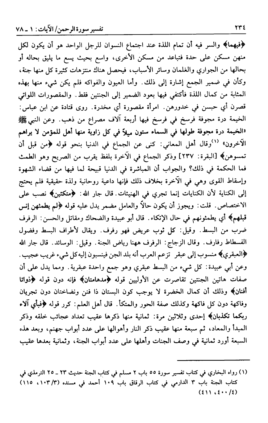 (1) رواه البخاري في كتاب تفسير سورة 55 باب 2 مسلم في كتاب الجنة حديث 23- 25 الترمذي في كتاب الجنة باب 3 الدارمي في كتاب الرقاق باب 109 أحمد في مسنده (3/ 103، 115) (4/ 400، 411)