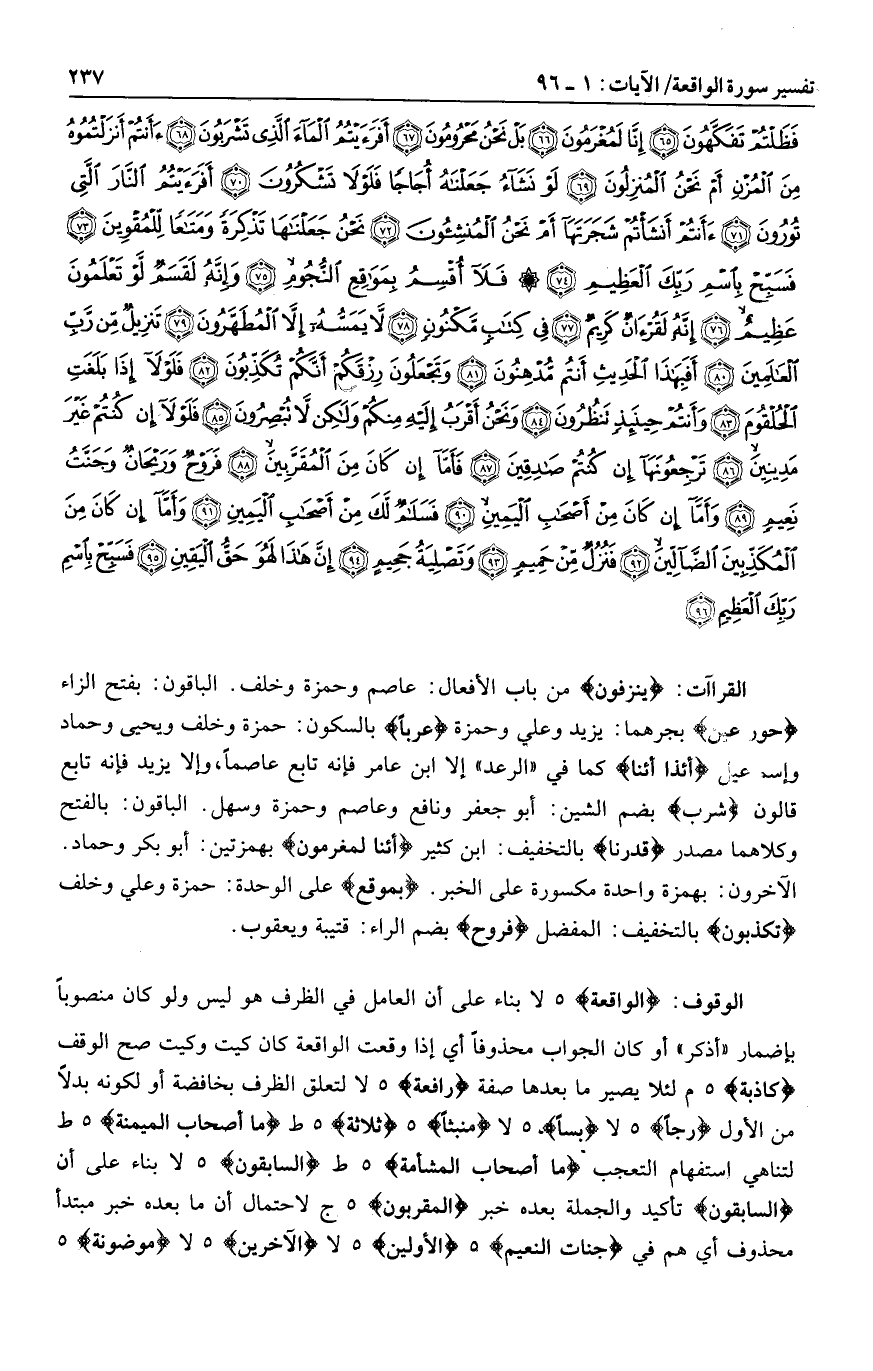 يُنْزِفُونَ من باب الأفعال: عاصم وحمزة وخلف. الباقون: بفتح الزاء حور عين بجرهما: يزيد وعلي وحمزة عربا بالسكون: حمزة وخلف ويحيى وحماد وإسماعيل أَإِذا مِتْنا وَكُنَّا كما في «الرعد» إلا ابن عامر فإنه تابع عاصما، وإلا يزيد فإنه تابع قالون شُرْبَ بضم الشين: أبو جعفر ونافع وعاصم وحمزة وسهل. الباقون: بالفتح وكلاهما مصدر قدرنا بالتخفيف: ابن كثير اانا لمغرمون بهمزتين: أبو بكر وحماد.