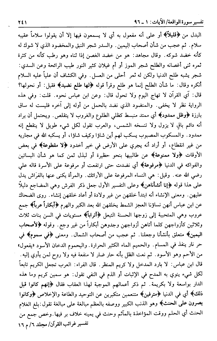 قال: آي القرآن لا تهاج اليوم ولا تحول قال: وعن ابن عباس نحوه. قلت: وفي هذه الرواية نظر لا يخفى. والمنضود الذي نضد بالحمل من أوله إلى آخره فليست له ساق بارزة وَظِلٍّ مَمْدُودٍ أي ممتد منبسط كظلي الطلوع والغروب لا يتقلص. ويحتمل أن يراد أنه دائم باق لا يزول ولا تنسخه الشمس، والعرب تقول لكل شيء طويل لا ينقطع إنه ممدود. والمسكوب المصبوب يسكب لهم أين شاؤا وكيف شاؤا، أو يسكبه الله في مجاريه من غير انقطاع، أو أراد أنه يجري على الأرض في خير أخدود لا مَقْطُوعَةٍ في بعض الأوقات وَلا مَمْنُوعَةٍ عن طالبيها بنحو حظيرة أو لبذل ثمن كما هو شأن البساتين والفواكه في الدنيا مَرْفُوعَةٍ أي نضدت حتى ارتفعت أو مرفوعة على الأسرة قاله علي رضي الله عنه. وقيل: هي النساء المرفوعة على الأرائك. والمرأة يكنى عنها بالفراش يدل على هذا قوله إِنَّا أَنْشَأْناهُنَّ وعلى التفسير الأول جعل ذكر الفرش وهي المضاجع دليلا عليهن. ومعنى الإنشاء أنه ابتدأ خلقهن من غير ولادة أو أعاد خلقهن إنشاء. روى الضحاك عن ابن عباس أنهن نساؤنا العجز الشمط يخلقهن الله بعد الكبر والهرم أَبْكاراً عُرُباً جمع عروب وهي المتحببة إلى زوجها الحسنة التبعل أَتْراباً مستويات في السن بنات ثلاث وثلاثين كأزواجهن كلما أتاهن أزواجهن وجدوهن أبكارا من غير وجع. وقوله لِأَصْحابِ الْيَمِينِ متعلق بأنشأنا وجعلنا. ثم عجب من أصحاب الشمال. ومعنى فِي سَمُومٍ في حر نار ينفذ في المسام. والحميم الماء الكثير الحرارة. واليحموم الدخان الأسود «يفعول» من الأحم وهو الأسود. ثم نعت الظل بأنه حار ضار لا منفعة فيه ولا روح لمن يأوي إليه.