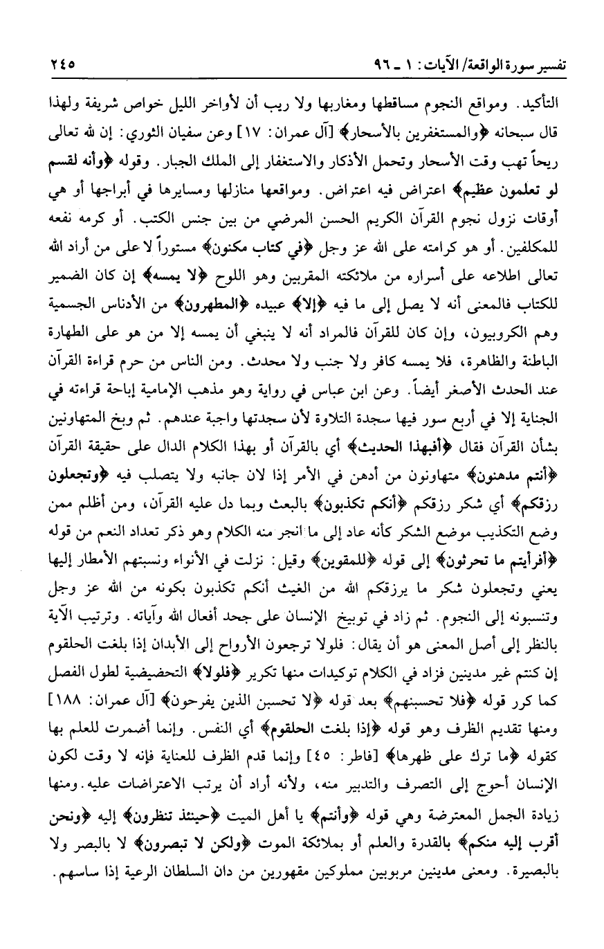 التأكيد. ومواقع النجوم مساقطها ومغاربها ولا ريب أن لأواخر الليل خواص شريفة ولهذا قال سبحانه وَالْمُسْتَغْفِرِينَ بِالْأَسْحارِ [آل عمران: 17] وعن سفيان الثوري: إن لله تعالى ريحا تهب وقت الأسحار وتحمل الأذكار والاستغفار إلى الملك الجبار. وقوله وَإِنَّهُ لَقَسَمٌ لَوْ تَعْلَمُونَ عَظِيمٌ اعتراض فيه اعتراض. ومواقعها منازلها ومسايرها في أبراجها أو هي أوقات نزول نجوم القرآن الكريم الحسن المرضي من بين جنس الكتب. أو كرمه نفعه للمكلفين. أو هو كرامته على الله عز وجل فِي كِتابٍ مَكْنُونٍ مستورا لا على من أراد الله تعالى اطلاعه على أسراره من ملائكته المقربين وهو اللوح لا يَمَسُّهُ إن كان الضمير للكتاب فالمعنى أنه لا يصل إلى ما فيه إِلَّا عبيده الْمُطَهَّرُونَ من الأدناس الجسمية وهم الكروبيون، وإن كان للقرآن فالمراد أنه لا ينبغي أن يمسه إلا من هو على الطهارة الباطنة والظاهرة، فلا يمسه كافر ولا جنب ولا محدث. ومن الناس من حرم قراءة القرآن عند الحدث الأصغر أيضا. وعن ابن عباس في رواية وهو مذهب الإمامية إباحة قراءته في الجناية إلا في أربع سور فيها سجدة التلاوة لأن سجدتها واجبة عندهم. ثم وبخ المتهاونين بشأن القرآن فقال أَفَبِهذَا الْحَدِيثِ أي بالقرآن أو بهذا الكلام الدال على حقيقة القرآن أَنْتُمْ مُدْهِنُونَ متهاونون من أدهن في الأمر إذا لان جانبه ولا يتصلب فيه وَتَجْعَلُونَ رِزْقَكُمْ أي شكر رزقكم أَنَّكُمْ تُكَذِّبُونَ بالبعث وبما دل عليه القرآن، ومن أظلم ممن وضع التكذيب موضع الشكر كأنه عاد إلى ما انجر منه الكلام وهو ذكر تعداد النعم من قوله أَفَرَأَيْتُمْ ما تَحْرُثُونَ إلى قوله لِلْمُقْوِينَ وقيل: نزلت في الأنواء ونسبتهم الأمطار إليها يعني وتجعلون شكر ما يرزقكم الله من الغيث أنكم تكذبون بكونه من الله عز وجل وتنسبونه إلى النجوم. ثم زاد في توبيخ الإنسان على جحد أفعال الله وآياته. وترتيب الآية بالنظر إلى أصل المعنى هو أن يقال: فلولا ترجعون الأرواح إلى الأبدان إذا بلغت الحلقوم إن كنتم غير مدينين فزاد في الكلام توكيدات منها تكرير فَلَوْلا التحضيضية لطول الفصل كما كرر قوله فَلا تَحْسَبَنَّهُمْ بعد قوله لا تَحْسَبَنَّ الَّذِينَ يَفْرَحُونَ [آل عمران: 188] ومنها تقديم الظرف وهو قوله إِذا بَلَغَتِ الْحُلْقُومَ أي النفس. وإنما أضمرت للعلم بها كقوله ما تَرَكَ عَلى ظَهْرِها [فاطر: 45] وإنما قدم الظرف للعناية فإنه لا وقت لكون الإنسان أحوج إلى التصرف والتدبير منه، ولأنه أراد أن يرتب الاعتراضات عليه. ومنها زيادة الجمل المعترضة وهي قوله وَأَنْتُمْ يا أهل الميت حِينَئِذٍ تَنْظُرُونَ إليه وَنَحْنُ أَقْرَبُ إِلَيْهِ مِنْكُمْ بالقدرة والعلم أو بملائكة الموت وَلكِنْ لا تُبْصِرُونَ لا بالبصر ولا بالبصيرة. ومعنى مدينين مربوبين مملوكين مقهورين من دان السلطان الرعية إذا ساسهم.