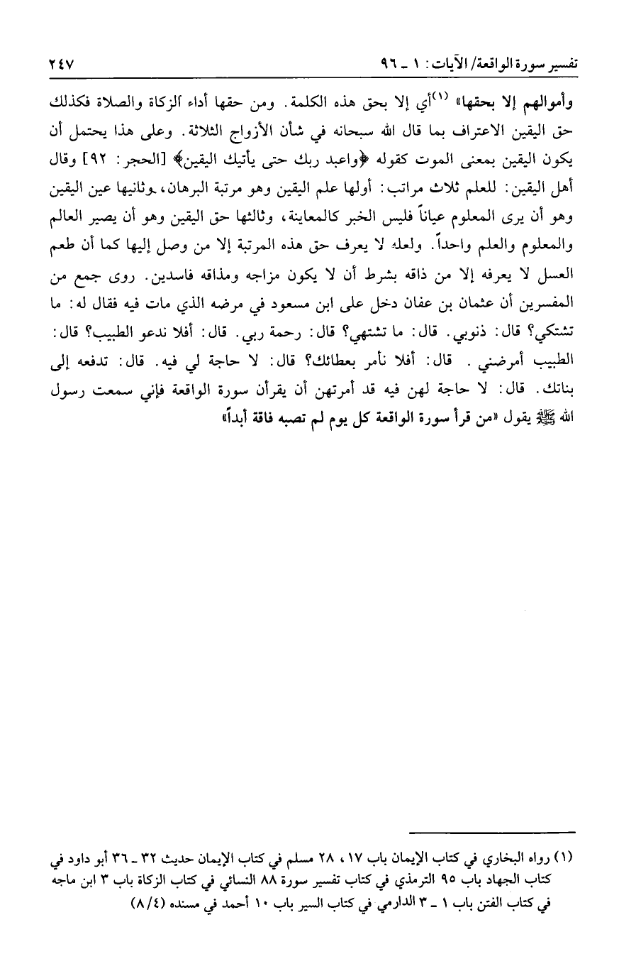 الطبيب أمرضني. قال: أفلا نأمر بعطائك؟ قال: لا حاجة لي فيه. قال: تدفعه إلى بناتك. قال: لا حاجة لهن فيه قد أمرتهن أن يقرأن سورة الواقعة فإني سمعت رسول الله صلى الله عليه وسلم يقول «من قرأ سورة الواقعة كل يوم لم تصبه فاقة أبدا»