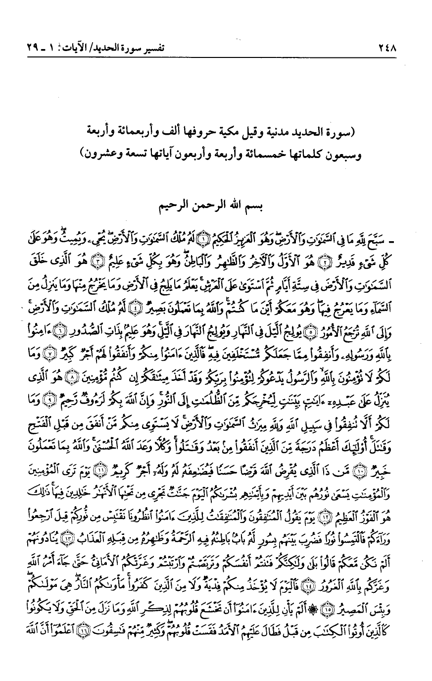 لَقَدْ أَرْسَلْنا رُسُلَنا بِالْبَيِّناتِ وَأَنْزَلْنا مَعَهُمُ الْكِتابَ وَالْمِيزانَ لِيَقُومَ النَّاسُ بِالْقِسْطِ وَأَنْزَلْنَا الْحَدِيدَ فِيهِ بَأْسٌ شَدِيدٌ وَمَنافِعُ لِلنَّاسِ وَلِيَعْلَمَ اللَّهُ مَنْ يَنْصُرُهُ وَرُسُلَهُ بِالْغَيْبِ إِنَّ اللَّهَ قَوِيٌّ عَزِيزٌ (25) وَلَقَدْ أَرْسَلْنا نُوحاً وَإِبْراهِيمَ وَجَعَلْنا فِي ذُرِّيَّتِهِمَا النُّبُوَّةَ وَالْكِتابَ فَمِنْهُمْ مُهْتَدٍ وَكَثِيرٌ مِنْهُمْ فاسِقُونَ (26) ثُمَّ قَفَّيْنا عَلى آثارِهِمْ بِرُسُلِنا وَقَفَّيْنا بِعِيسَى ابْنِ مَرْيَمَ وَآتَيْناهُ الْإِنْجِيلَ وَجَعَلْنا فِي قُلُوبِ الَّذِينَ اتَّبَعُوهُ رَأْفَةً وَرَحْمَةً وَرَهْبانِيَّةً ابْتَدَعُوها ما كَتَبْناها عَلَيْهِمْ إِلاَّ ابْتِغاءَ رِضْوانِ اللَّهِ فَما رَعَوْها حَقَّ رِعايَتِها فَآتَيْنَا الَّذِينَ آمَنُوا مِنْهُمْ أَجْرَهُمْ وَكَثِيرٌ مِنْهُمْ فاسِقُونَ (27) يا أَيُّهَا الَّذِينَ آمَنُوا اتَّقُوا اللَّهَ وَآمِنُوا بِرَسُولِهِ يُؤْتِكُمْ كِفْلَيْنِ مِنْ رَحْمَتِهِ وَيَجْعَلْ لَكُمْ نُوراً تَمْشُونَ بِهِ وَيَغْفِرْ لَكُمْ وَاللَّهُ غَفُورٌ رَحِيمٌ (28) لِئَلاَّ يَعْلَمَ أَهْلُ الْكِتابِ أَلاَّ يَقْدِرُونَ عَلى شَيْءٍ مِنْ فَضْلِ اللَّهِ وَأَنَّ الْفَضْلَ بِيَدِ اللَّهِ يُؤْتِيهِ مَنْ يَشاءُ وَاللَّهُ ذُو الْفَضْلِ الْعَظِيمِ (29)