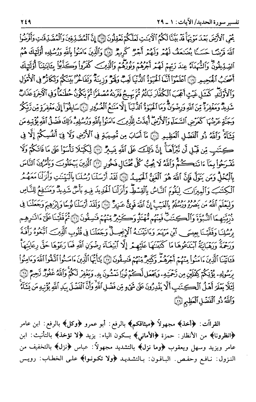 أخذ مجهولا ميثاقكم بالرفع: أبو عمرو وكل بالرفع: ابن عامر انْظُرُونا من الأنظار: حمزة الأماني بسكون الياء: يزيد لا تؤخذ بالتأنيث: ابن عامر ويزيد وسهل ويعقوب وما نزل بالتشديد مجهولا: عباس نَزَلَ بالتخفيف من النزول: نافع وحفص. الباقون: بالتشديد ولا تكونوا على الخطاب: رويس