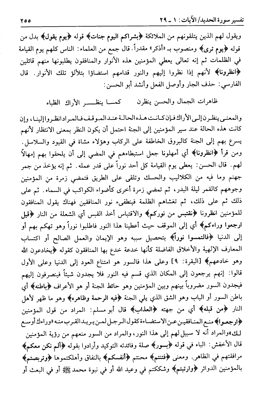 ويقول لهم الذين يتلقونهم من الملائكة بُشْراكُمُ الْيَوْمَ جَنَّاتٌ قوله يَوْمَ يَقُولُ بدل من قوله يَوْمَ تَرَى ومنصوب ب «أذكر» مقدرا. قال جمع من العلماء: الناس كلهم يوم القيامة في الظلمات ثم إنه تعالى يعطي المؤمنين هذه الأنوار والمنافقون يطلبونها منهم قائلين انْظُرُونا لأنهم إذا نظروا إليهم والنور قدامهم استضاؤا بتلألؤ تلك الأنوار. قال الفارسي: حذف الجار وأوصل الفعل وأنشد أبو الحسن: