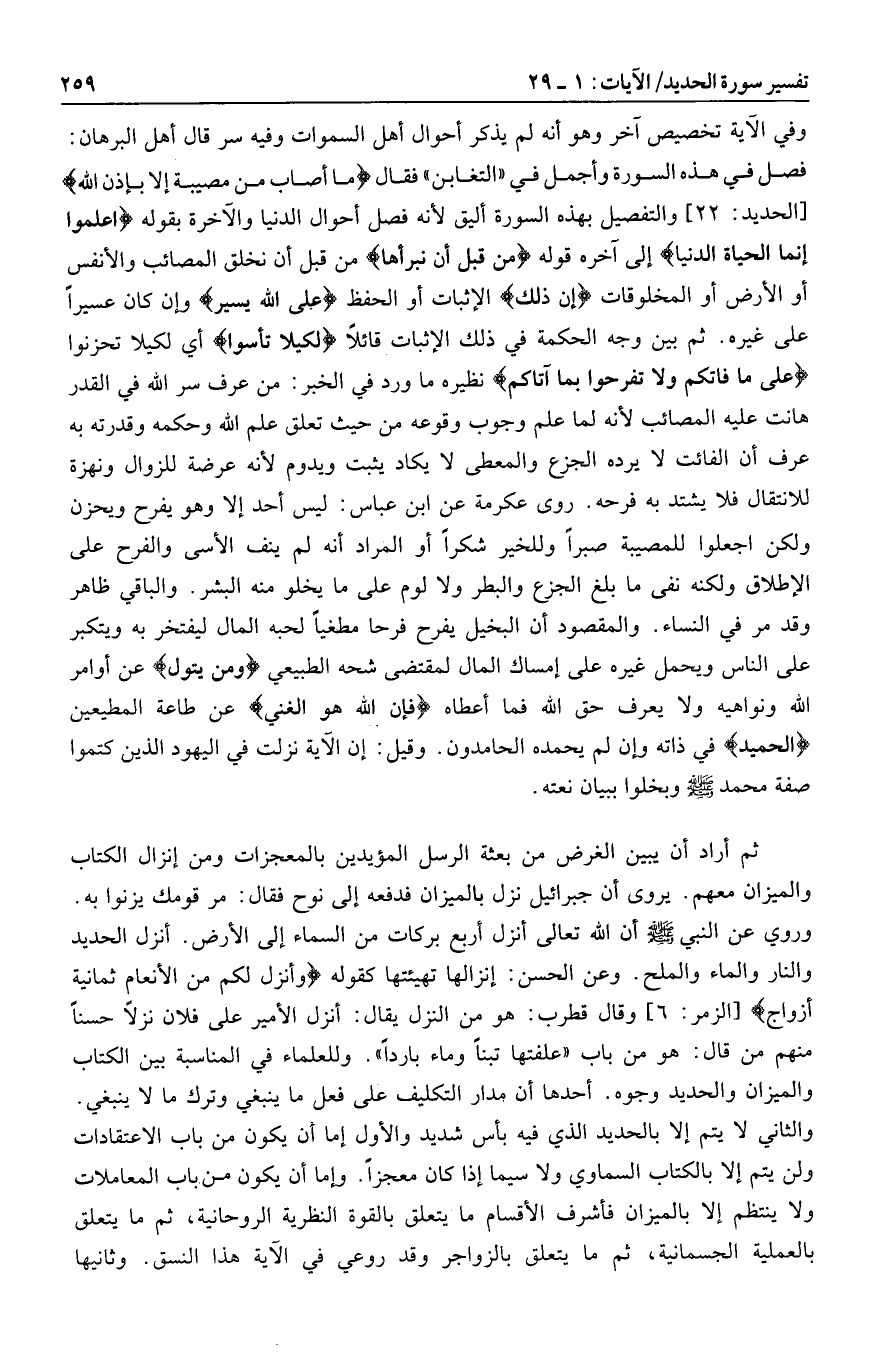 والثاني لا يتم إلا بالحديد الذي فيه بأس شديد والأول إما أن يكون من باب الاعتقادات ولن يتم إلا بالكتاب السماوي ولا سيما إذا كان معجزا. وإما أن يكون من باب المعاملات ولا ينتظم إلا بالميزان فأشرف الأقسام ما يتعلق بالقوة النظرية الروحانية، ثم ما يتعلق بالعملية الجسمانية، ثم ما يتعلق بالزواجر وقد روعي في الآية هذا النسق. وثانيها