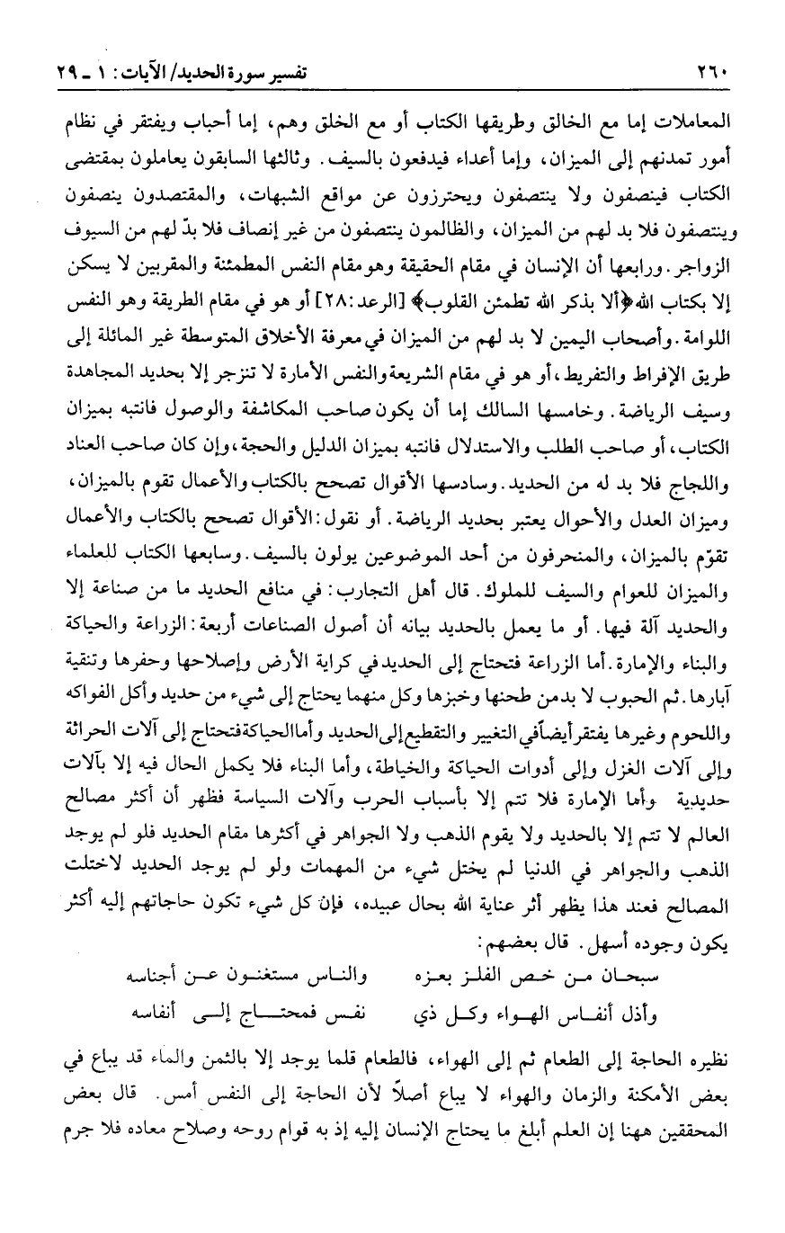 المعاملات إما مع الخالق وطريقها الكتاب أو مع الخلق وهم، إما أحباب ويفتقر في نظام أمور تمدنهم إلى الميزان، وإما أعداء فيدفعون بالسيف. وثالثها السابقون يعاملون بمقتضى الكتاب فينصفون ولا ينتصفون ويحترزون عن مواقع الشبهات، والمقتصدون ينصفون وينتصفون فلا بد لهم من الميزان، والظالمون ينتصفون من غير إنصاف فلا بدّ لهم من السيوف الزواجر. ورابعها أن الإنسان في مقام الحقيقة وهو مقام النفس المطمئنة والمقربين لا يسكن إلا بكتاب الله أَلا بِذِكْرِ اللَّهِ تَطْمَئِنُّ الْقُلُوبُ [الرعد: 28] أو هو في مقام الطريقة وهو النفس اللوامة. وأصحاب اليمين لا بد لهم من الميزان في معرفة الأخلاق المتوسطة غير المائلة إلى طريق الإفراط والتفريط، أو هو في مقام الشريعة والنفس الأمارة لا تنزجر إلا بحديد المجاهدة وسيف الرياضة. وخامسها السالك إما أن يكون صاحب المكاشفة والوصول فانتبه بميزان الكتاب، أو صاحب الطلب والاستدلال فانتبه بميزان الدليل والحجة، وإن كان صاحب العناد واللجاج فلا بد له من الحديد. وسادسها الأقوال تصحح بالكتاب والأعمال تقوم بالميزان، وميزان العدل والأحوال يعتبر بحديد الرياضة. أو نقول: الأقوال تصحح بالكتاب والأعمال تقوّم بالميزان، والمنحرفون من أحد الموضوعين يولون بالسيف. وسابعها الكتاب للعلماء والميزان للعوام والسيف للملوك. قال أهل التجارب: في منافع الحديد ما من صناعة إلا والحديد آلة فيها. أو ما يعمل بالحديد بيانه أن أصول الصناعات أربعة: الزراعة والحياكة والبناء والإمارة. أما الزراعة فتحتاج إلى الحديد في كراية الأرض وإصلاحها وحفرها وتنقية آبارها. ثم الحبوب لا بد من طحنها وخبزها وكل منهما يحتاج إلى شيء من حديد وأكل الفواكه واللحوم وغيرها يفتقر أيضا في التغيير والتقطيع إلى الحديد وأما الحياكة فتحتاج إلى آلات الحراثة وإلى آلات الغزل وإلى أدوات الحياكة والخياطة، وأما البناء فلا يكمل الحال فيه إلا بآلات حديدية وأما الإمارة فلا تتم إلا بأسباب الحرب وآلات السياسة فظهر أن أكثر مصالح العالم لا تتم إلا بالحديد ولا يقوم الذهب ولا الجواهر في أكثرها مقام الحديد فلو لم يوجد الذهب والجواهر في الدنيا لم يختل شيء من المهمات ولو لم يوجد الحديد لاختلت المصالح فعند هذا يظهر أثر عناية الله بحال عبيده، فإن كل شيء تكون حاجاتهم إليه أكثر يكون وجوده أسهل. قال بعضهم: