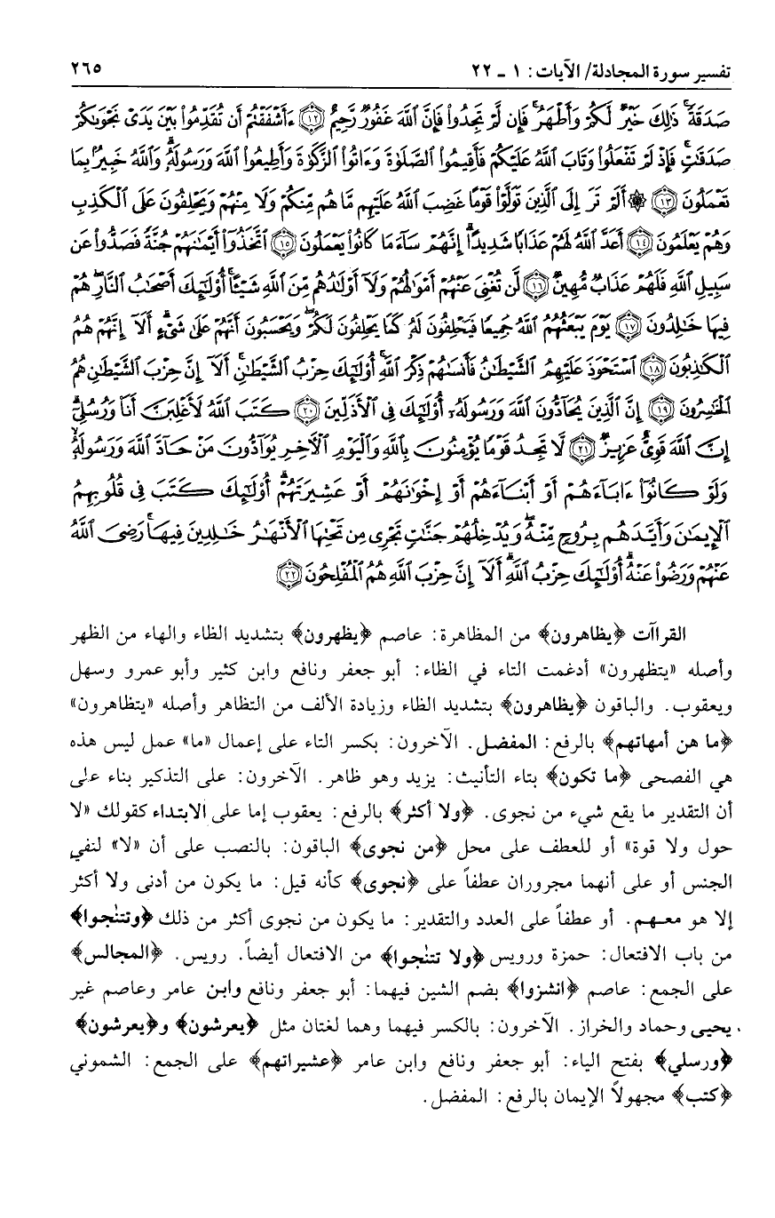 يظهرون من المظاهرة: عاصم يظهرون بتشديد الظاء والهاء من الظهر وأصله «يتظهرون» أدغمت التاء في الظاء: أبو جعفر ونافع وابن كثير وأبو عمرو وسهل ويعقوب. والباقون يظهرون بتشديد الظاء وزيادة الألف من التظاهر وأصله «يتظاهرون» ما هن أمهاتهم بالرفع: المفضل. الآخرون: بكسر التاء على إعمال «ما» عمل ليس هذه هي الفصحى ما تكون بتاء التأنيث: يزيد وهو ظاهر. الآخرون: على التذكير بناء على أن التقدير ما يقع شيء من نجوى. ولا أكثر بالرفع: يعقوب إما على الابتداء كقولك «لا حول ولا قوة» أو للعطف على محل مِنْ نَجْوى الباقون: بالنصب على أن «لا» لنفي الجنس أو على أنهما مجروران عطفا على نَجْوى كأنه قيل: ما يكون من أدنى ولا أكثر إلا هو معهم. أو عطفا على العدد والتقدير: ما يكون من نجوى أكثر من ذلك وتَتَناجَوْا من باب الافتعال: حمزة ورويس وفَلا تَتَناجَوْا من الافتعال أيضا. رويس. الْمَجالِسِ على الجمع: عاصم انْشُزُوا بضم الشين فيهما: أبو جعفر ونافع وابن عامر وعاصم غير يحيى وحماد والخراز. الآخرون: بالكسر فيهما وهما لغتان مثل يَعْرِشُونَ ويَعْرِشُونَ ورسلي بفتح الياء: أبو جعفر ونافع وابن عامر عشيراتهم على الجمع: الشموني كتب مجهولا الإيمان بالرفع: المفضل.