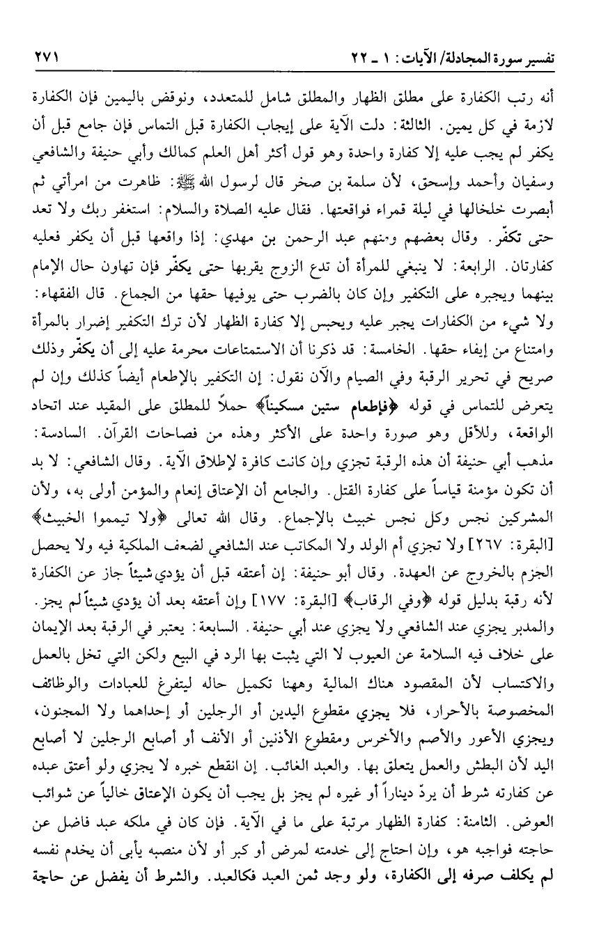 ولا شيء من الكفارات يجبر عليه ويحبس إلا كفارة الظهار لأن ترك التكفير إضرار بالمرأة وامتناع من إيفاء حقها. الخامسة: قد ذكرنا أن الاستمتاعات محرمة عليه إلى أن يكفّر وذلك صريح في تحرير الرقبة وفي الصيام والآن نقول: إن التكفير بالإطعام أيضا كذلك وإن لم يتعرض للتماس في قوله فَإِطْعامُ سِتِّينَ مِسْكِيناً حملا للمطلق على المقيد عند اتحاد الواقعة، وللأقل وهو صورة واحدة على الأكثر وهذه من فصاحات القرآن. السادسة: