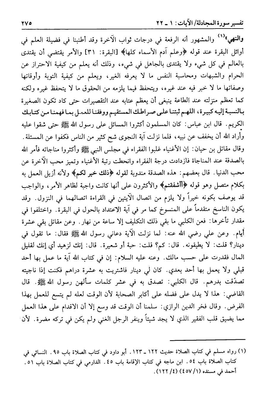 والمشهور أنه الرفعة في درجات ثواب الآخرة وقد أطنبنا في فضيلة العلم في أوائل البقرة عند قوله وَعَلَّمَ آدَمَ الْأَسْماءَ كُلَّها [البقرة: 31] والأمر يقتضي أن يقتدى بالعالم في كل شيء ولا يقتدى بالجاهل في شيء، وذلك أنه يعلم من كيفية الاحتراز عن الحرام والشبهات ومحاسبة النفس ما لا يعرفه الغير، ويعلم من كيفية التوبة وأوقاتها وصفاتها ما لا خبر فيه عند غيره، ويتحفظ فيما يلزمه من الحقوق ما لا يتحفظ غيره ولكنه كما تعظم منزلته عند الطاعة ينبغى أن يعظم عتابه عند التقصيرات حتى كاد تكون الصغيرة بالنسبة إليه كبيرة، اللهم ثبتنا على صراطك المستقيم ووفقنا للعمل بما فهمنا من كتابك الكريم. قال ابن عباس: كان المسلمون أكثروا المسائل على رسول الله صلى الله عليه وسلم حتى شقوا عليه وأراد الله أن يخفف عن نبيه، فلما نزلت آية النجوى شح كثير من الناس فكفوا عن المسألة.