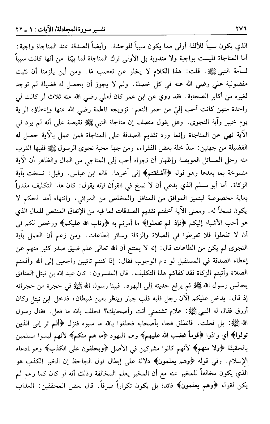 وهل يقول منصف إن مناجاة النبي صلى الله عليه وسلم نقيصة على أنه لم يرد في الآية نهي عن المناجاة وإنما ورد تقديم الصدقة على المناجاة فمن عمل بالآية حصل له الفضيلة من جهتين: سدّ خلة بعض الفقراء، ومن جهة محبة نجوى الرسول صلى الله عليه وسلم ففيها القرب منه وحل المسائل العويصة وإظهار أن نجواه أحب إلى المناجي من المال والظاهر أن الآية منسوخة بما بعدها وهو قوله أَأَشْفَقْتُمْ إلى آخرها. قاله ابن عباس. وقيل: نسخت بآية الزكاة. أما أبو مسلم الذي يدعي أن لا نسخ في القرآن فإنه يقول: كان هذا التكليف مقدرا بغاية مخصوصة ليتميز الموافق من المنافق والمخلص من المرائي، وانتهاء أمد الحكم لا يكون نسخا له. ومعنى الآية أخفتم تقديم الصدقات لما فيه من الإنفاق المنقص للمال الذي هو أحب الأشياء إليكم فَإِذْ لَمْ تَفْعَلُوا ما أمرتم به وَتابَ اللَّهُ عَلَيْكُمْ ورخص لكم في أن لا تفعلوا فلا تفرطوا في الصلاة والزكاة وسائر الطاعات. ومن زعم أن العمل بآية النجوى لم يكن من الطاعات قال: إنه لا يمتنع أن الله تعالى علم ضيق صدر كثير منهم عن إعطاء الصدقة في المستقبل لو دام الوجوب فقال: إذا كنتم تائبين راجعين إلى الله وأقمتم الصلاة وآتيتم الزكاة فقد كفاكم هذا التكليف.