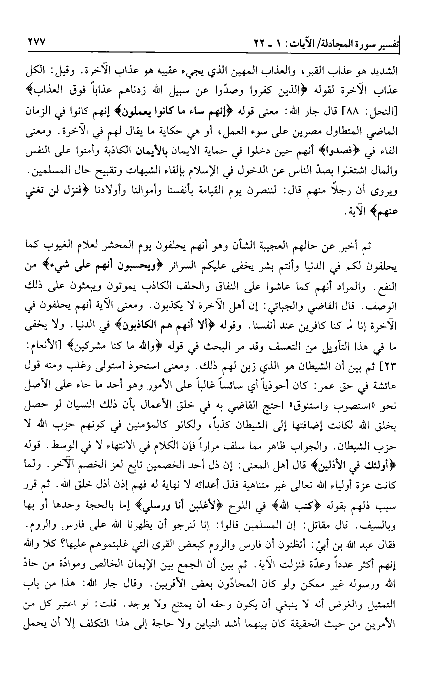 23] ثم بين أن الشيطان هو الذي زين لهم ذلك. ومعنى استحوذ استولى وغلب ومنه قول عائشة في حق عمر: كان أحوذيا أي سائسا غالبا على الأمور وهو أحد ما جاء على الأصل نحو «استصوب واستنوق» احتج القاضي به في خلق الأعمال بأن ذلك النسيان لو حصل بخلق الله لكانت إضافتها إلى الشيطان كذبا، ولكانوا كالمؤمنين في كونهم حزب الله لا حزب الشيطان. والجواب ظاهر مما سلف مرارا فإن الكلام في الانتهاء لا في الوسط. قوله أُولئِكَ فِي الْأَذَلِّينَ قال أهل المعنى: إن ذل أحد الخصمين تابع لعز الخصم الآخر. ولما كانت عزة أولياء الله تعالى غير متناهية فذل أعدائه لا نهاية له فهم إذن أذل خلق الله. ثم قرر سبب ذلهم بقوله كَتَبَ اللَّهُ في اللوح لَأَغْلِبَنَّ أَنَا وَرُسُلِي إما بالحجة وحدها أو بها وبالسيف. قال مقاتل: إن المسلمين قالوا: إنا لنرجو أن يظهرنا الله على فارس والروم.