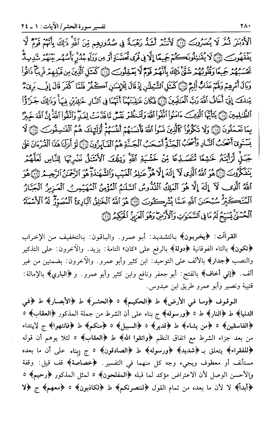 وَما فِي الْأَرْضِ ط الْحَكِيمُ هـ الْحَشْرِ ط الْأَبْصارِ ط فِي الدُّنْيا ط النَّارِ ط هـ وَرَسُولَهُ ج بناء على أن الشرط من جملة المذكور الْعِقابِ هـ الْفاسِقِينَ هـ مَنْ يَشاءُ ط قَدِيرٌ هـ السَّبِيلِ هـ مِنْكُمْ ط فَانْتَهُوا ج لابتداء من بعد جزاء الشرط مع اتفاق النظم وَاتَّقُوا اللَّهَ ط الْعِقابِ هـ لئلا يوهم أن قوله لِلْفُقَراءِ يتعلق ب شَدِيدُ ورَسُولِهِ ط الصَّادِقُونَ هـ ج بناء على أن ما بعده مستأنف أو معطوف ويجيء وجه كل منهما في التفسير. خَصاصَةٌ قف قيل: وقفة والأحسن الوصل لأن الاعتراض مؤكد لما قبله الْمُفْلِحُونَ هـ لمثل المذكور رَحِيمٌ هـ أَبَداً لا لأن ما بعده من تمام القول لَنَنْصُرَنَّكُمْ ط لَكاذِبُونَ هـ مَعَهُمْ ج لا