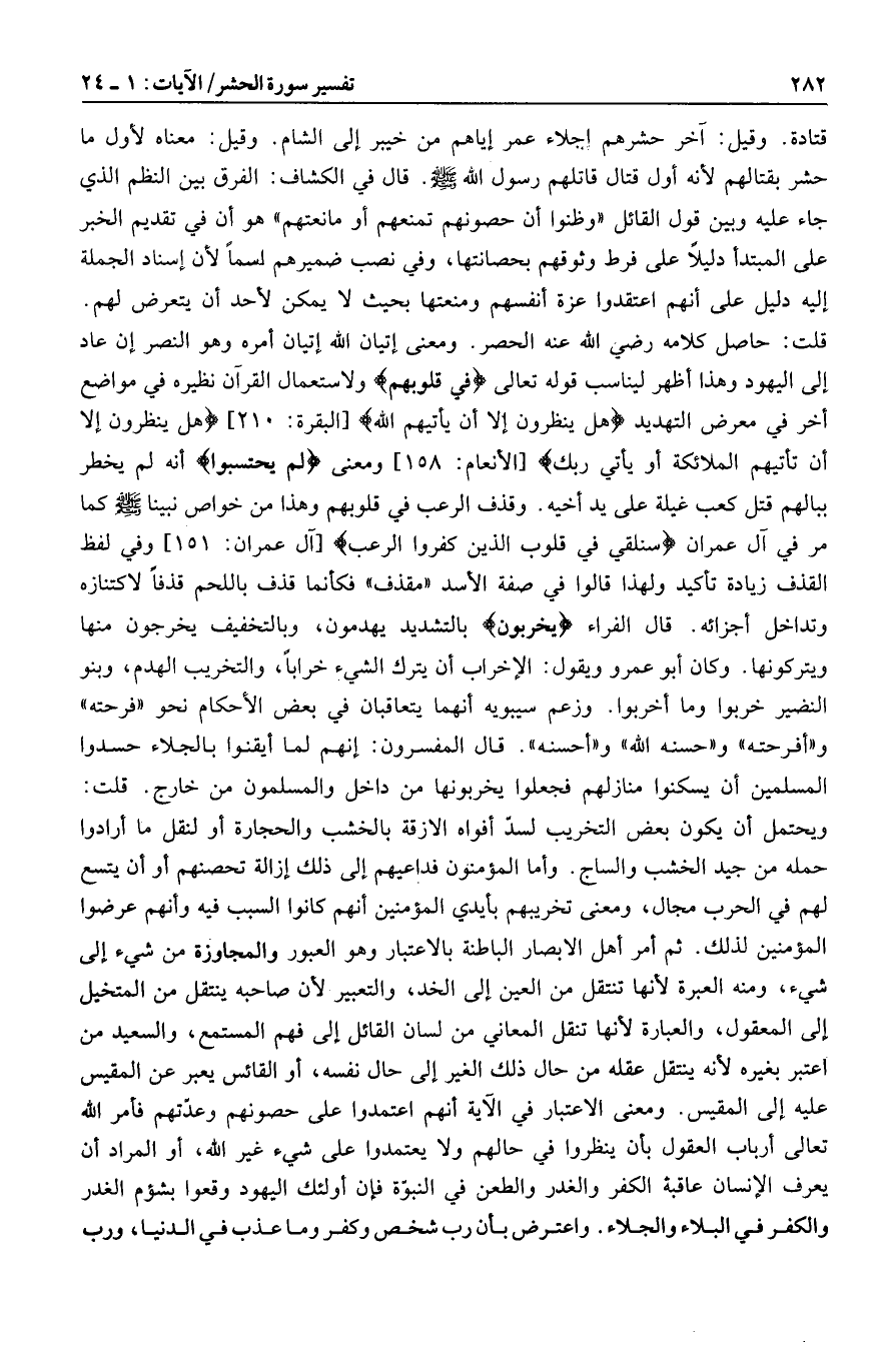 قلت: حاصل كلامه رضي الله عنه الحصر. ومعنى إتيان الله إتيان أمره وهو النصر إن عاد إلى اليهود وهذا أظهر ليناسب قوله تعالى فِي قُلُوبِهِمُ ولاستعمال القرآن نظيره في مواضع أخر في معرض التهديد هَلْ يَنْظُرُونَ إِلَّا أَنْ يَأْتِيَهُمُ اللَّهُ [البقرة: 210] هَلْ يَنْظُرُونَ إِلَّا أَنْ تَأْتِيَهُمُ الْمَلائِكَةُ أَوْ يَأْتِيَ رَبُّكَ [الأنعام: 158] ومعنى لَمْ يَحْتَسِبُوا أنه لم يخطر ببالهم قتل كعب غيلة على يد أخيه. وقذف الرعب في قلوبهم وهذا من خواص نبينا صلى الله عليه وسلم كما مر في آل عمران سَنُلْقِي فِي قُلُوبِ الَّذِينَ كَفَرُوا الرُّعْبَ [آل عمران: 151] وفي لفظ القذف زيادة تأكيد ولهذا قالوا في صفة الأسد «مقذف» فكأنما قذف باللحم قذفا لاكتنازه وتداخل أجزائه. قال الفراء يُخْرِبُونَ بالتشديد يهدمون، وبالتخفيف يخرجون منها ويتركونها. وكان أبو عمرو ويقول: الإخراب أن يترك الشيء خرابا، والتخريب الهدم، وبنو النضير خربوا وما أخربوا. وزعم سيبويه أنهما يتعاقبان في بعض الأحكام نحو «فرحته» و «أفرحته» و «حسنه الله» و «أحسنه» . قال المفسرون: إنهم لما أيقنوا بالجلاء حسدوا المسلمين أن يسكنوا منازلهم فجعلوا يخربونها من داخل والمسلمون من خارج. قلت: