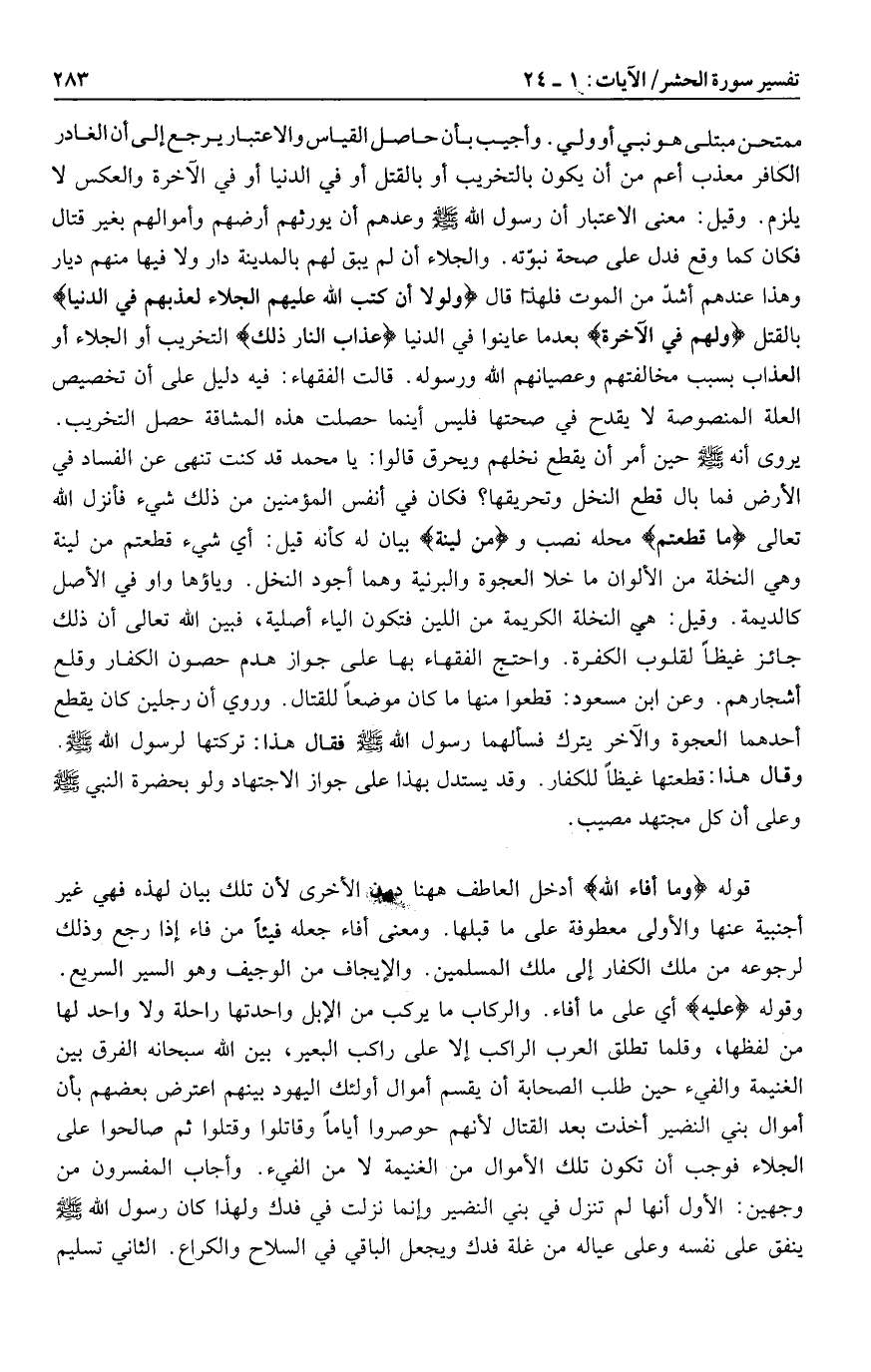 وقوله عَلَيْهِ أي على ما أفاء. والركاب ما يركب من الإبل واحدتها راحلة ولا واحد لها من لفظها، وقلما تطلق العرب الراكب إلا على راكب البعير، بين الله سبحانه الفرق بين الغنيمة والفيء حين طلب الصحابة أن يقسم أموال أولئك اليهود بينهم اعترض بعضهم بأن أموال بني النضير أخذت بعد القتال لأنهم حوصروا أياما وقاتلوا وقتلوا ثم صالحوا على الجلاء فوجب أن تكون تلك الأموال من الغنيمة لا من الفيء. وأجاب المفسرون من وجهين: الأول أنها لم تنزل في بني النضير وإنما نزلت في فدك ولهذا كان رسول الله صلى الله عليه وسلم ينفق على نفسه وعلى عياله من غلة فدك ويجعل الباقي في السلاح والكراع. الثاني تسليم