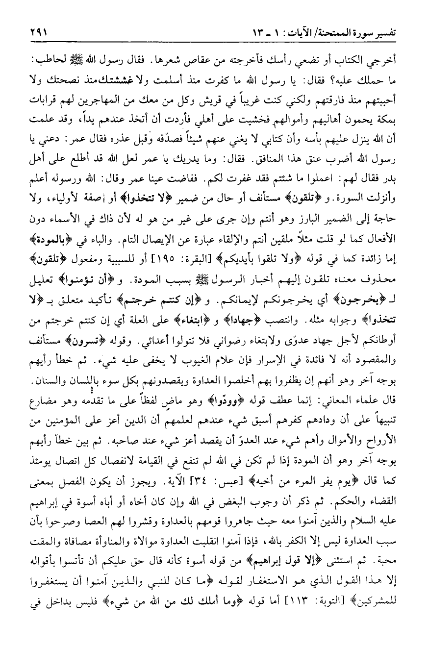 ما حملك عليه؟ فقال: يا رسول الله ما كفرت منذ أسلمت ولا غششتك منذ نصحتك ولا أحببتهم منذ فارقتهم ولكني كنت غريبا في قريش وكل من معك من المهاجرين لهم قرابات بمكة يحمون أهاليهم وأموالهم فخشيت على أهلي فأردت أن أتخذ عندهم يدا، وقد علمت أن الله ينزل عليهم بأسه وأن كتابي لا يغني عنهم شيئا فصدّقه وقبل عذره فقال عمر: دعني يا رسول الله أضرب عنق هذا المنافق. فقال: وما يدريك يا عمر لعل الله قد أطلع على أهل بدر فقال لهم: اعملوا ما شئتم فقد غفرت لكم. ففاضت عينا عمر وقال: الله ورسوله أعلم وأنزلت السورة.