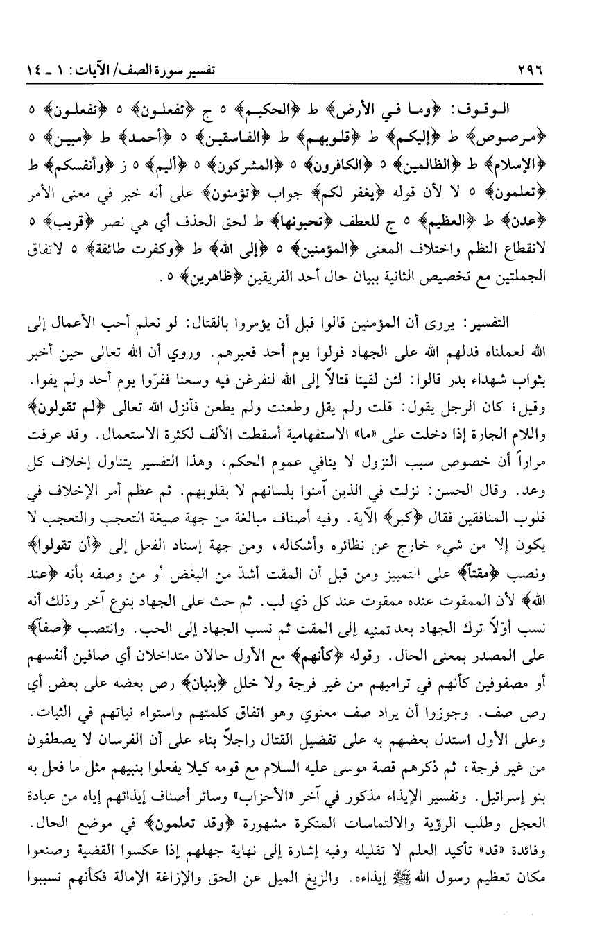 وَما فِي الْأَرْضِ ط الْحَكِيمُ هـ ج تَفْعَلُونَ هـ تَفْعَلُونَ هـ مَرْصُوصٌ ط إِلَيْكُمْ ط قُلُوبَهُمْ ط الْفاسِقِينَ هـ أَحْمَدُ ط مُبِينٌ هـ الْإِسْلامِ ط الظَّالِمِينَ هـ الْكافِرُونَ هـ الْمُشْرِكُونَ هـ أَلِيمٍ هـ ز وَأَنْفُسِكُمْ ط تَعْلَمُونَ هـ لا لأن قوله يَغْفِرْ لَكُمْ جواب تُؤْمِنُونَ على أنه خبر في معنى الأمر عَدْنٍ ط الْعَظِيمُ هـ ج للعطف تُحِبُّونَها ط لحق الحذف أي هي نصر قَرِيبٌ هـ لانقطاع النظم واختلاف المعنى الْمُؤْمِنِينَ هـ إِلَى اللَّهِ ط وَكَفَرَتْ طائِفَةٌ هـ لاتفاق الجملتين مع تخصيص الثانية ببيان حال أحد الفريقين ظاهِرِينَ هـ.