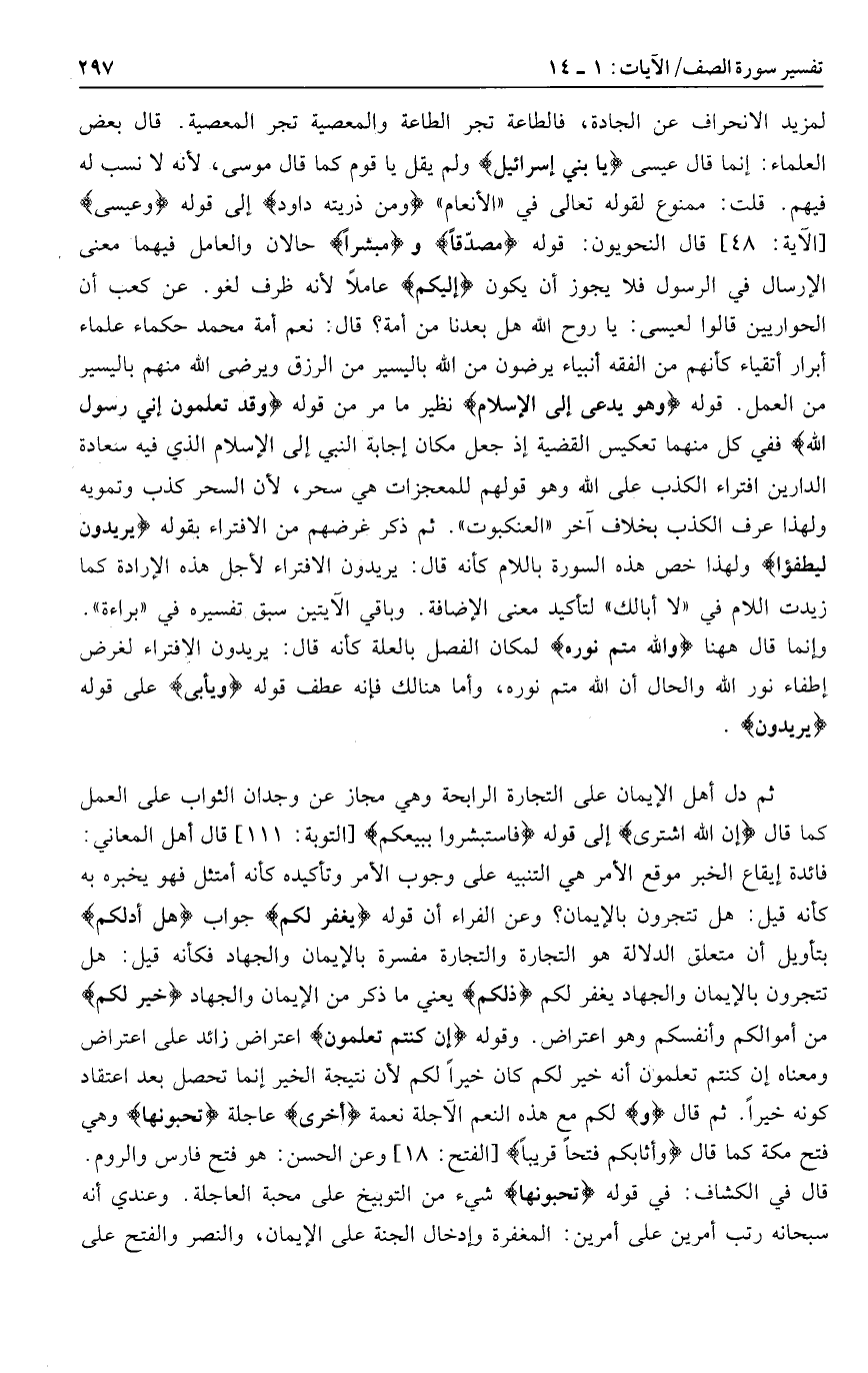 لمزيد الانحراف عن الجادة، فالطاعة تجر الطاعة والمعصية تجر المعصية. قال بعض العلماء: إنما قال عيسى يا بَنِي إِسْرائِيلَ ولم يقل يا قوم كما قال موسى، لأنه لا نسب له فيهم. قلت: ممنوع لقوله تعالى في «الأنعام» وَمِنْ ذُرِّيَّتِهِ داوُدَ إلى قوله وَعِيسى [الآية: 48] قال النحويون: قوله مُصَدِّقاً ومُبَشِّراً حالان والعامل فيهما معنى الإرسال في الرسول فلا يجوز أن يكون إِلَيْكُمْ عاملا لأنه ظرف لغو. عن كعب أن الحواريين قالوا لعيسى: يا روح الله هل بعدنا من أمة؟ قال: نعم أمة محمد حكماء علماء أبرار أتقياء كأنهم من الفقه أنبياء يرضون من الله باليسير من الرزق ويرضى الله منهم باليسير من العمل. قوله وَهُوَ يُدْعى إِلَى الْإِسْلامِ نظير ما مر من قوله وَقَدْ تَعْلَمُونَ أَنِّي رَسُولُ اللَّهِ ففي كل منهما تعكيس القضية إذ جعل مكان إجابة النبي إلى الإسلام الذي فيه سعادة الدارين افتراء الكذب على الله وهو قولهم للمعجزات هي سحر، لأن السحر كذب وتمويه ولهذا عرف الكذب بخلاف آخر «العنكبوت» . ثم ذكر غرضهم من الافتراء بقوله يُرِيدُونَ لِيُطْفِؤُا ولهذا خص هذه السورة باللام كأنه قال: يريدون الافتراء لأجل هذه الإرادة كما زيدت اللام في «لا أبالك» لتأكيد معنى الإضافة. وباقي الآيتين سبق تفسيره في «براءة» .