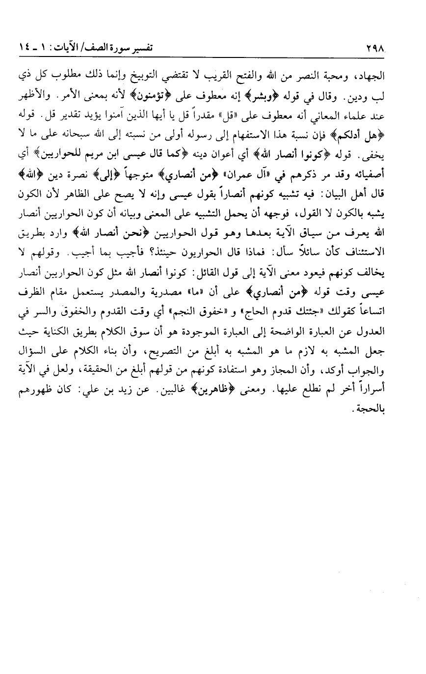 الجهاد، ومحبة النصر من الله والفتح القريب لا تقتضي التوبيخ وإنما ذلك مطلوب كل ذي لب ودين. وقال في قوله وَبَشِّرِ إنه معطوف على تُؤْمِنُونَ لأنه بمعنى الأمر. والأظهر عند علماء المعاني أنه معطوف على «قل» مقدرا قل يا أيها الذين آمنوا يؤيد تقدير قل. قوله هَلْ أَدُلُّكُمْ فإن نسبة هذا الاستفهام إلى رسوله أولى من نسبته إلى الله سبحانه على ما لا يخفى. قوله كُونُوا أَنْصارَ اللَّهِ أي أعوان دينه كَما قالَ عِيسَى ابْنُ مَرْيَمَ لِلْحَوارِيِّينَ أي أصفيائه وقد مر ذكرهم في «آل عمران» مَنْ أَنْصارِي متوجها إِلَى نصرة دين اللَّهِ قال أهل البيان: فيه تشبيه كونهم أنصارا بقول عيسى وإنه لا يصح على الظاهر لأن الكون يشبه بالكون لا القول، فوجهه أن يحمل التشبيه على المعنى وبيانه أن كون الحواريين أنصار الله يعرف من سياق الآية بعدها وهو قول الحواريين نَحْنُ أَنْصارُ اللَّهِ وارد بطريق الاستئناف كأن سائلا سأل: فماذا قال الحواريون حينئذ؟ فأجيب بما أجيب. وقولهم لا يخالف كونهم فيعود معنى الآية إلى قول القائل: كونوا أنصار الله مثل كون الحواريين أنصار عيسى وقت قوله مَنْ أَنْصارِي على أن «ما» مصدرية والمصدر يستعمل مقام الظرف اتساعا كقولك «جئتك قدوم الحاج» و «خفوق النجم» أي وقت القدوم والخفوق والسر في العدول عن العبارة الواضحة إلى العبارة الموجودة هو أن سوق الكلام بطريق الكناية حيث جعل المشبه به لازم ما هو المشبه به أبلغ من التصريح، وأن بناء الكلام على السؤال والجواب أوكد، وأن المجاز وهو استفادة كونهم من قولهم أبلغ من الحقيقة، ولعل في الآية أسرارا أخر لم نطلع عليها. ومعنى ظاهِرِينَ غالبين. عن زيد بن علي: كان ظهورهم بالحجة.