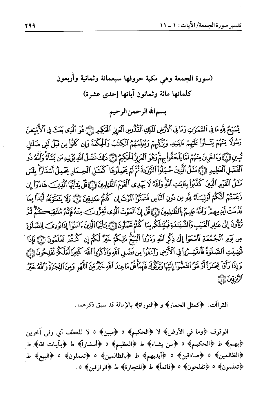 وَما فِي الْأَرْضِ لا الْحَكِيمِ هـ مُبِينٍ هـ لا للعطف أي وفي آخرين بِهِمْ ط الْحَكِيمُ هـ مَنْ يَشاءُ ط الْعَظِيمِ هـ أَسْفاراً ط بِآياتِ اللَّهِ ط الظَّالِمِينَ هـ صادِقِينَ هـ أَيْدِيهِمْ ط بِالظَّالِمِينَ هـ تَعْلَمُونَ هـ الْبَيْعَ ط تَعْلَمُونَ هـ تُفْلِحُونَ هـ قائِماً ط التِّجارَةِ ط الرَّازِقِينَ هـ.