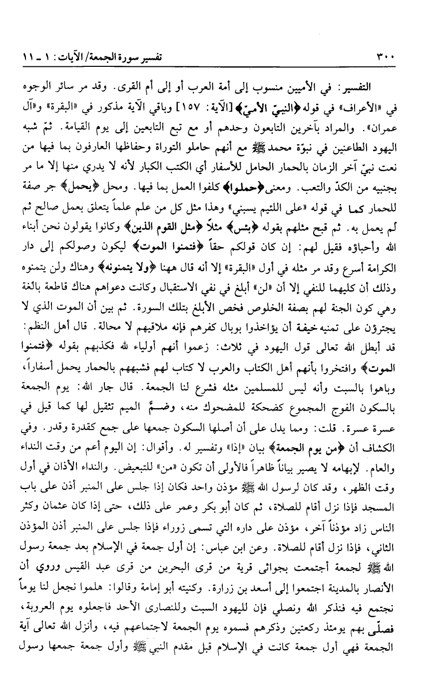 في الأميين منسوب إلى أمة العرب أو إلى أم القرى. وقد مر سائر الوجوه في «الأعراف» في قوله النَّبِيَّ الْأُمِّيَّ [الآية: 157] وباقي الآية مذكور في «البقرة» و «آل عمران» . والمراد بآخرين التابعون وحدهم أو مع تبع التابعين إلى يوم القيامة. ثمّ شبه اليهود الطاعنين في نبوّة محمد صلى الله عليه وسلم مع أنهم حاملو التوراة وحفاظها العارفون بما فيها من نعت نبيّ آخر الزمان بالحمار الحامل للأسفار أي الكتب الكبار لأنه لا يدري منها إلا ما مر بجنبيه من الكدّ والتعب. ومعنى حُمِّلُوا كلفوا العمل بما فيها. ومحل يَحْمِلُ جر صفة للحمار كما في قوله «على اللئيم يسبني» وهذا مثل كل من علم علما يتعلق بعمل صالح ثم لم يعمل به. ثم قبح مثلهم بقوله بِئْسَ مثلا مَثَلُ الْقَوْمِ الَّذِينَ وكانوا يقولون نحن أبناء الله وأحباؤه فقيل لهم: إن كان قولكم حقا فَتَمَنَّوُا الْمَوْتَ ليكون وصولكم إلى دار الكرامة أسرع وقد مر مثله في أول «البقرة» إلا أنه قال هاهنا وَلا يَتَمَنَّوْنَهُ وهناك ولن يتمنوه وذلك أن كليهما للنفي إلا أن «لن» أبلغ في نفي الاستقبال وكانت دعواهم هناك قاطعة بالغة وهي كون الجنة لهم بصفة الخلوص فخص الأبلغ بتلك السورة. ثم بين أن الموت الذي لا يجترؤن على تمنيه خيفة أن يؤاخذوا بوبال كفرهم فإنه ملاقيهم لا محالة. قال أهل النظم:
