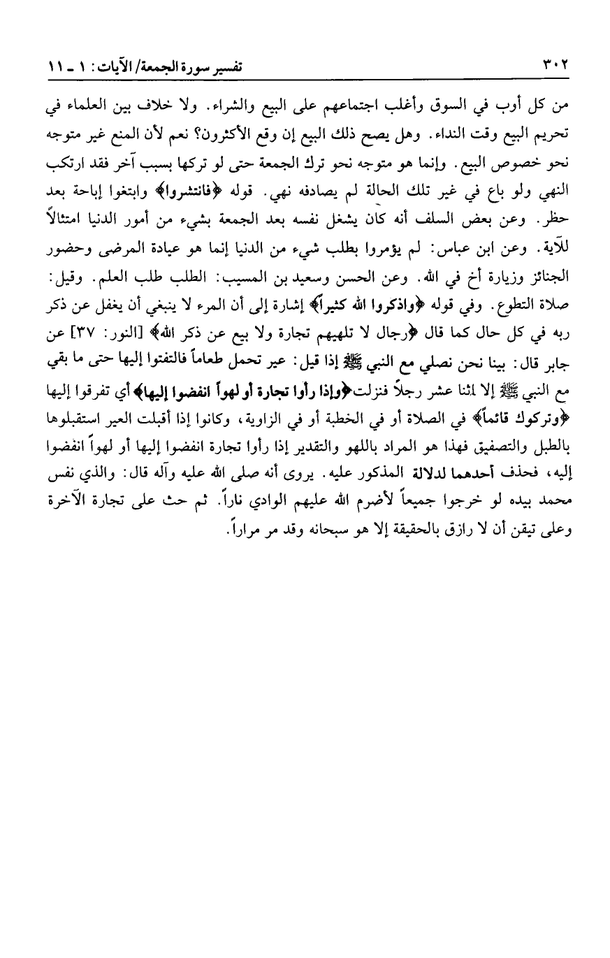 من كل أوب في السوق وأغلب اجتماعهم على البيع والشراء. ولا خلاف بين العلماء في تحريم البيع وقت النداء. وهل يصح ذلك البيع إن وقع الأكثرون؟ نعم لأن المنع غير متوجه نحو خصوص البيع. وإنما هو متوجه نحو ترك الجمعة حتى لو تركها بسبب آخر فقد ارتكب النهي ولو باع في غير تلك الحالة لم يصادفه نهي. قوله فَانْتَشِرُوا وابتغوا إباحة بعد حظر. وعن بعض السلف أنه كان يشغل نفسه بعد الجمعة بشيء من أمور الدنيا امتثالا للآية. وعن ابن عباس: لم يؤمروا بطلب شيء من الدنيا إنما هو عيادة المرضى وحضور الجنائز وزيارة أخ في الله. وعن الحسن وسعيد بن المسيب: الطلب طلب العلم. وقيل: