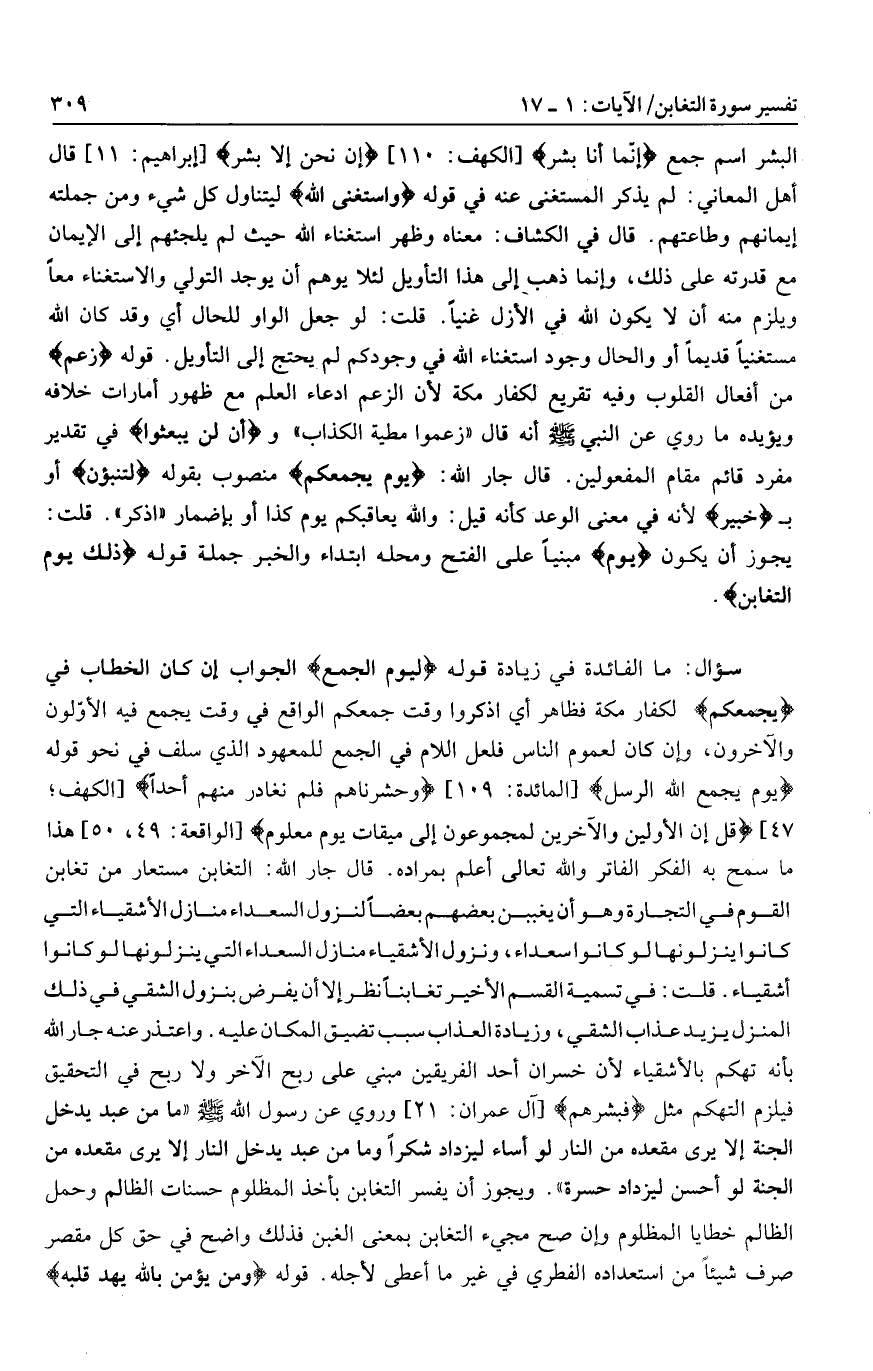سؤال: ما الفائدة في زيادة قوله لِيَوْمِ الْجَمْعِ الجواب إن كان الخطاب في يَجْمَعُكُمْ لكفار مكة فظاهر أي اذكروا وقت جمعكم الواقع في وقت يجمع فيه الأوّلون والآخرون، وإن كان لعموم الناس فلعل اللام في الجمع للمعهود الذي سلف في نحو قوله يَوْمَ يَجْمَعُ اللَّهُ الرُّسُلَ [المائدة: 109] وَحَشَرْناهُمْ فَلَمْ نُغادِرْ مِنْهُمْ أَحَداً [الكهف 47] قُلْ إِنَّ الْأَوَّلِينَ وَالْآخِرِينَ لَمَجْمُوعُونَ إِلى مِيقاتِ يَوْمٍ مَعْلُومٍ [الواقعة: 49، 50] هذا ما سمح به الفكر الفاتر والله تعالى أعلم بمراده. قال جار الله: التغابن مستعار من تغابن القوم في التجارة وهو أن يغببن بعضهم بعضا لنزول السعداء منازل الأشقياء التي كانوا ينزلونها لو كانوا سعداء، ونزول الأشقياء منازل السعداء التي ينزلونها لو كانوا أشقياء. قلت: في تسمية القسم الأخير تغابنا نظر إلا أن يفرض بنزول الشقي في ذلك المنزل يزيد عذاب الشقي، وزيادة العذاب سبب تضيق المكان عليه. واعتذر عنه جار الله بأنه تهكم بالأشقياء لأن خسران أحد الفريقين مبني على ربح الآخر ولا ربح في التحقيق فيلزم التهكم مثل فَبَشِّرْهُمْ [آل عمران: 21]