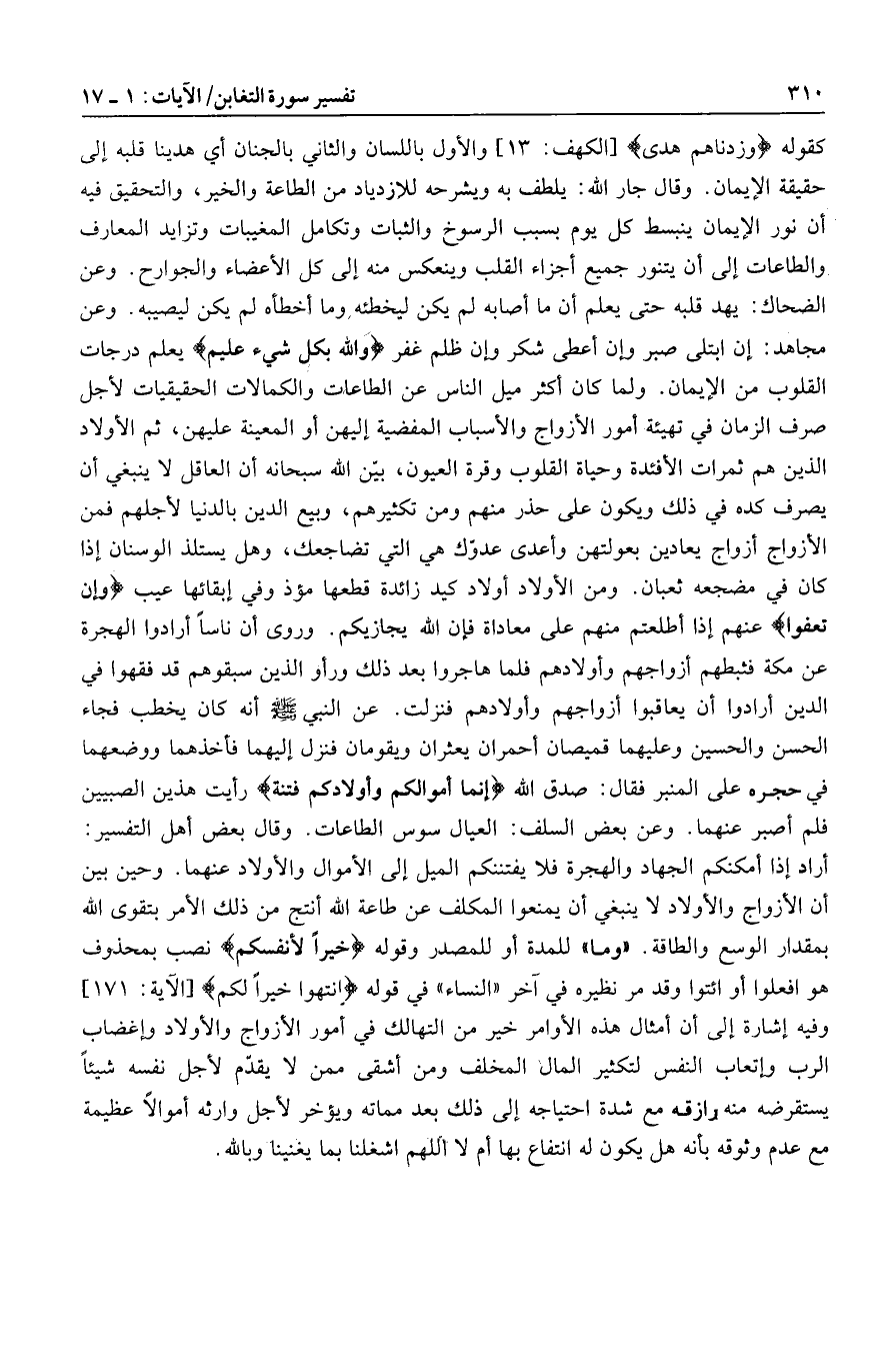 كقوله وَزِدْناهُمْ هُدىً [الكهف: 13] والأول باللسان والثاني بالجنان أي هدينا قلبه إلى حقيقة الإيمان. وقال جار الله: يلطف به ويشرحه للازدياد من الطاعة والخير، والتحقيق فيه أن نور الإيمان ينبسط كل يوم بسبب الرسوخ والثبات وتكامل المغيبات وتزايد المعارف والطاعات إلى أن يتنور جميع أجزاء القلب وينعكس منه إلى كل الأعضاء والجوارح. وعن الضحاك: يهد قلبه حتى يعلم أن ما أصابه لم يكن ليخطئه وما أخطأه لم يكن ليصيبه. وعن مجاهد: إن ابتلى صبر وإن أعطى شكر وإن ظلم غفر وَاللَّهُ بِكُلِّ شَيْءٍ عَلِيمٌ يعلم درجات القلوب من الإيمان. ولما كان أكثر ميل الناس عن الطاعات والكمالات الحقيقيات لأجل صرف الزمان في تهيئة أمور الأزواج والأسباب المفضية إليهن أو المعينة عليهن، ثم الأولاد الذين هم ثمرات الأفئدة وحياة القلوب وقرة العيون، بيّن الله سبحانه أن العاقل لا ينبغي أن يصرف كده في ذلك ويكون على حذر منهم ومن تكثيرهم، وبيع الدين بالدنيا لأجلهم فمن الأزواج أزواج يعادين بعولتهن وأعدى عدوّك هي التي تضاجعك، وهل يستلذ الوسنان إذا كان في مضجعه ثعبان. ومن الأولاد أولاد كيد زائدة قطعها مؤذ وفي إبقائها عيب وَإِنْ تَعْفُوا عنهم إذا أطلعتم منهم على معاداة فإن الله يجازيكم.