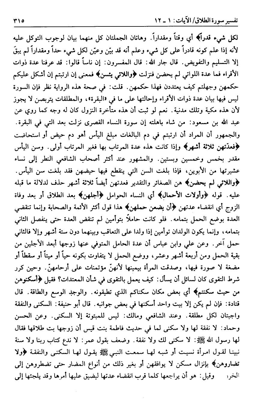 ووضع الحمل لا يتفاوت بكونه حيا أو ميتا أو سقطا أو مضغة لا صورة فيها، وصدقت المرأة بيمينها لأنهنّ مؤتمنات على أرحامهنّ. وحين كرر شرط التقوى كان لسائل أن يسأل: كيف يعمل بالتقوى في شأن المعتدات؟ فقيل أَسْكِنُوهُنَّ مِنْ حَيْثُ سَكَنْتُمْ أي بعض مكان سكناكم الذي تطيقونه. والوجد الوسع والطاقة. قال قتادة: فإن لم يكن إلا بيت واحد أسكنها في بعض جوانبه. قال أبو حنيفة: السكنى والنفقة واجبتان لكل مطلقة. وعند الشافعي ومالك: ليس للمبتوتة إلا السكنى.