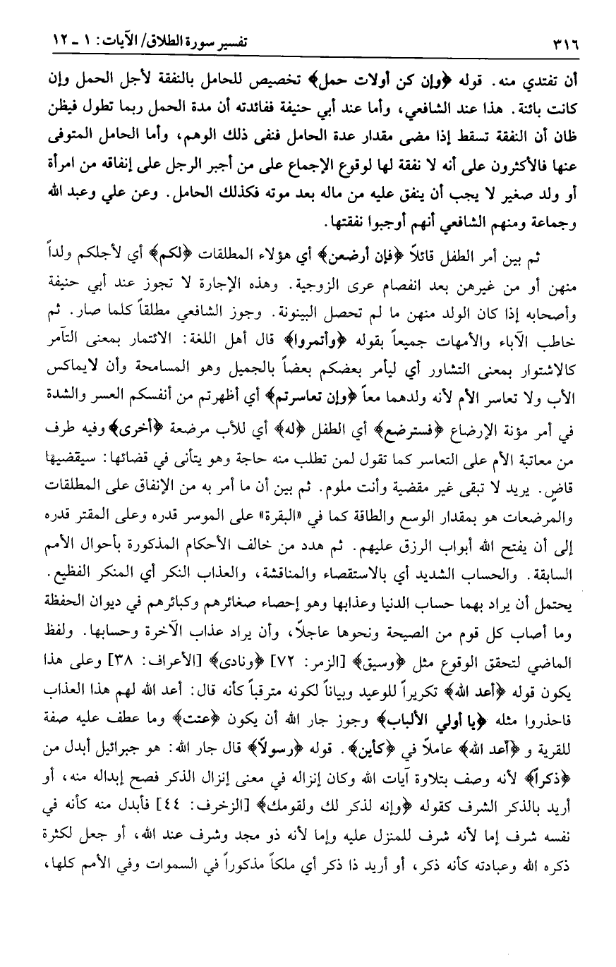 أن تفتدي منه. قوله وَإِنْ كُنَّ أُولاتِ حَمْلٍ تخصيص للحامل بالنفقة لأجل الحمل وإن كانت بائنة. هذا عند الشافعي، وأما عند أبي حنيفة ففائدته أن مدة الحمل ربما تطول فيظن ظان أن النفقة تسقط إذا مضى مقدار عدة الحامل فنفى ذلك الوهم، وأما الحامل المتوفى عنها فالأكثرون على أنه لا نفقة لها لوقوع الإجماع على من أجبر الرجل على إنفاقه من امرأة أو ولد صغير لا يجب أن ينفق عليه من ماله بعد موته فكذلك الحامل.