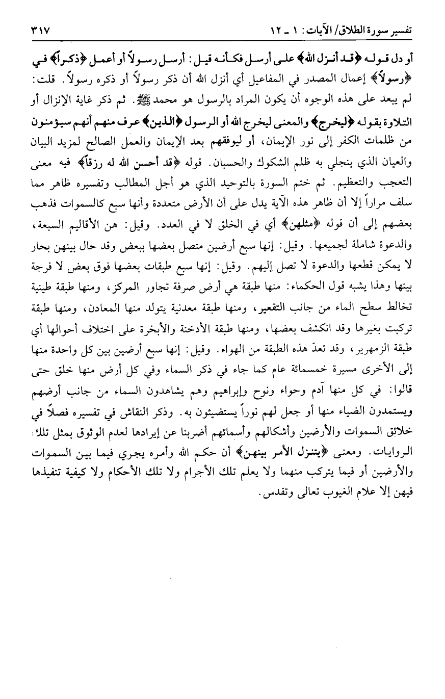 لم يبعد على هذه الوجوه أن يكون المراد بالرسول هو محمد صلى الله عليه وسلم. ثم ذكر غاية الإنزال أو التلاوة بقوله لِيُخْرِجَ والمعنى ليخرج الله أو الرسول الَّذِينَ عرف منهم أنهم سيؤمنون من ظلمات الكفر إلى نور الإيمان، أو ليوفقهم بعد الإيمان والعمل الصالح لمزيد البيان والعيان الذي ينجلي به ظلم الشكوك والحسبان. قوله قَدْ أَحْسَنَ اللَّهُ لَهُ رِزْقاً فيه معنى التعجب والتعظيم. ثم ختم السورة بالتوحيد الذي هو أجل المطالب وتفسيره ظاهر مما سلف مرارا إلا أن ظاهر هذه الآية يدل على أن الأرض متعددة وأنها سبع كالسموات فذهب بعضهم إلى أن قوله مِثْلَهُنَّ أي في الخلق لا في العدد. وقيل: هن الأقاليم السبعة، والدعوة شاملة لجميعها. وقيل: إنها سبع أرضين متصل بعضها ببعض وقد حال بينهن بحار لا يمكن قطعها والدعوة لا تصل إليهم. وقيل: إنها سبع طبقات بعضها فوق بعض لا فرجة بينها وهذا يشبه قول الحكماء: منها طبقة هي أرض صرفة تجاور المركز، ومنها طبقة طينية تخالط سطح الماء من جانب التقعير، ومنها طبقة معدنية يتولد منها المعادن، ومنها طبقة تركبت بغيرها وقد انكشف بعضها، ومنها طبقة الأدخنة والأبخرة على اختلاف أحوالها أي طبقة الزمهرير، وقد تعدّ هذه الطبقة من الهواء. وقيل: إنها سبع أرضين بين كل واحدة منها إلى الأخرى مسيرة خمسمائة عام كما جاء في ذكر السماء وفي كل أرض منها خلق حتى قالوا: في كل منها آدم وحواء ونوح وإبراهيم وهم يشاهدون السماء من جانب أرضهم ويستمدون الضياء منها أو جعل لهم نورا يستضيئون به. وذكر النقاش في تفسيره فصلا في خلائق السموات والأرضين وأشكالهم وأسمائهم أضربنا عن إيرادها لعدم الوثوق بمثل تلك الروايات. ومعنى يَتَنَزَّلُ الْأَمْرُ بَيْنَهُنَّ أن حكم الله وأمره يجري فيما بين السموات والأرضين أو فيما يتركب منهما ولا يعلم تلك الأجرام ولا تلك الأحكام ولا كيفية تنفيذها فيهن إلا علام الغيوب تعالى وتقدس.