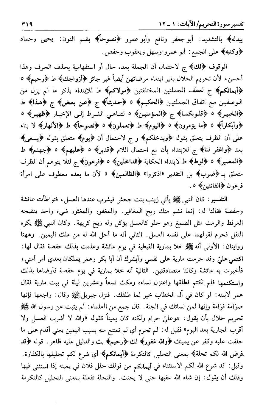 لَكَ ج لاحتمال أن الجملة بعده حال أو استفهامية بحذف الحرف وهذا أحسن، لأن تحريم الحلال بغير ابتغاء مرضاتهن أيضا غير جائز أَزْواجِكَ ط رَحِيمٌ هـ أَيْمانِكُمْ ج لعطف الجملتين المختلفتين مَوْلاكُمْ ط للابتداء بذكر ما لم يزل من الوصفين مع اتفاق الجملتين الْحَكِيمُ هـ حَدِيثاً ج عَنْ بَعْضٍ ج هذا ط الْخَبِيرُ هـ قُلُوبُكُما ج الْمُؤْمِنِينَ هـ لتناهي الشرط إلى الإخبار ظَهِيرٌ هـ وَأَبْكاراً هـ ما يُؤْمَرُونَ هـ الْيَوْمَ ط تَعْمَلُونَ هـ نَصُوحاً ط الْأَنْهارُ لا بناء على أن الظرف يتعلق بقوله وَيُدْخِلَكُمْ وج لاحتمال أن يَوْمَ متعلق بقوله يَسْعى بعد وَاغْفِرْ لَنا ج للابتداء بأن مع احتمال اللام قَدِيرٌ هـ عَلَيْهِمْ هـ جَهَنَّمُ ط الْمَصِيرُ هـ لُوطٍ ط لابتداء الحكاية الدَّاخِلِينَ هـ فِرْعَوْنَ ج لئلا يتوهم أن الظرف متعلق ب ضَرَبَ بل التقدير «اذكروا» الظَّالِمِينَ هـ لأن ما بعده معطوف على امرأة فرعون الْقانِتِينَ هـ.