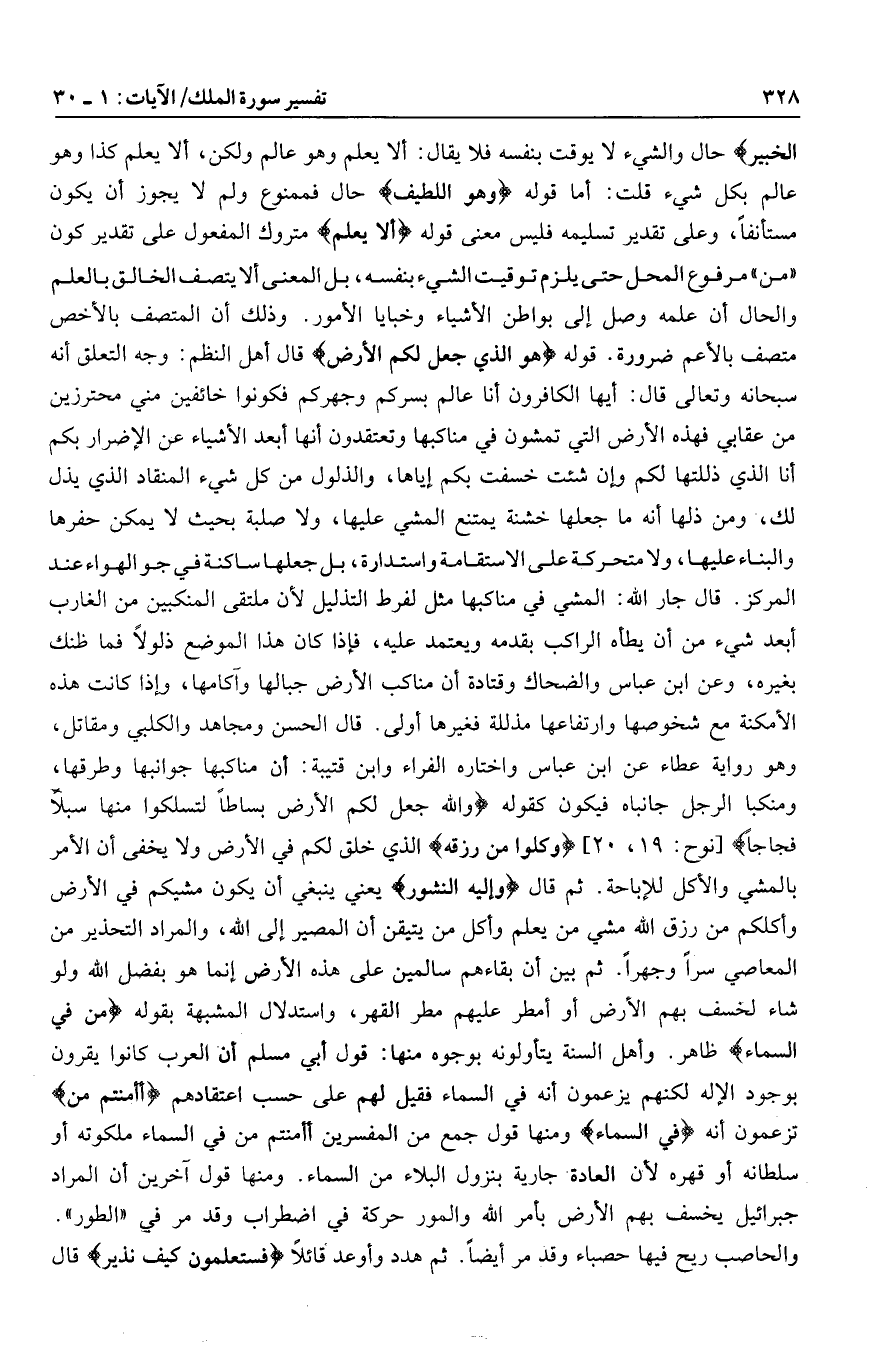 حال والشيء لا يوقت بنفسه فلا يقال: ألا يعلم وهو عالم ولكن، ألا يعلم كذا وهو عالم بكل شيء قلت: أما قوله وَهُوَ اللَّطِيفُ حال فممنوع ولم لا يجوز أن يكون مستأنفا، وعلى تقدير تسليمه فليس معنى قوله أَلا يَعْلَمُ متروك المفعول على تقدير كون «من» مرفوع المحل حتى يلزم توقيت الشيء بنفسه، بل المعنى ألا يتصف الخالق بالعلم والحال أن علمه وصل إلى بواطن الأشياء وخبايا الأمور. وذلك أن المتصف بالأخص متصف بالأعم ضرورة. قوله هُوَ الَّذِي جَعَلَ لَكُمُ الْأَرْضَ قال أهل النظم: وجه التعلق أنه سبحانه وتعالى قال: أيها الكافرون أنا عالم بسركم وجهركم فكونوا خائفين مني محترزين من عقابي فهذه الأرض التي تمشون في مناكبها وتعتقدون أنها أبعد الأشياء عن الإضرار بكم أنا الذي ذللتها لكم وإن شئت خسفت بكم إياها، والذلول من كل شيء المنقاد الذي يذل لك، ومن ذلها أنه ما جعلها خشنة يمتنع المشي عليها، ولا صلبة بحيث لا يمكن حفرها والبناء عليها، ولا متحركة على الاستقامة واستدارة، بل جعلها ساكنة في جو الهواء عند المركز. قال جار الله: المشي في مناكبها مثل لفرط التذليل لأن ملتقى المنكبين من الغارب أبعد شيء من أن يطأه الراكب بقدمه ويعتمد عليه، فإذا كان هذا الموضع ذلولا فما ظنك بغيره، وعن ابن عباس والضحاك وقتادة أن مناكب الأرض جبالها وآكامها، وإذا كانت هذه الأمكنة مع شخوصها وارتفاعها مذللة فغيرها أولى. قال الحسن ومجاهد والكلبي ومقاتل، وهو رواية عطاء عن ابن عباس واختاره الفراء وابن قتيبة: أن مناكبها جوانبها وطرقها، ومنكبا الرجل جانباه فيكون كقوله وَاللَّهُ جَعَلَ لَكُمُ الْأَرْضَ بِساطاً لِتَسْلُكُوا مِنْها سُبُلًا فِجاجاً [نوح: 19، 20] وَكُلُوا مِنْ رِزْقِهِ الذي خلق لكم في الأرض ولا يخفى أن الأمر بالمشي والأكل للإباحة. ثم قال وَإِلَيْهِ النُّشُورُ يعني ينبغي أن يكون مشيكم في الأرض وأكلكم من رزق الله مشي من يعلم وأكل من يتيقن أن المصير إلى الله، والمراد التحذير من المعاصي سرا وجهرا. ثم بين أن بقاءهم سالمين على هذه الأرض إنما هو بفضل الله ولو شاء لخسف بهم الأرض أو أمطر عليهم مطر القهر، واستدلال المشبهة بقوله مَنْ فِي السَّماءِ ظاهر. وأهل السنة يتأولونه بوجوه منها: قول أبي مسلم أن العرب كانوا يقرون بوجود الإله لكنهم يزعمون أنه في السماء فقيل لهم على حسب اعتقادهم أَأَمِنْتُمْ مَنْ تزعمون أنه فِي السَّماءِ ومنها قول جمع من المفسرين أأمنتم من في السماء ملكوته أو