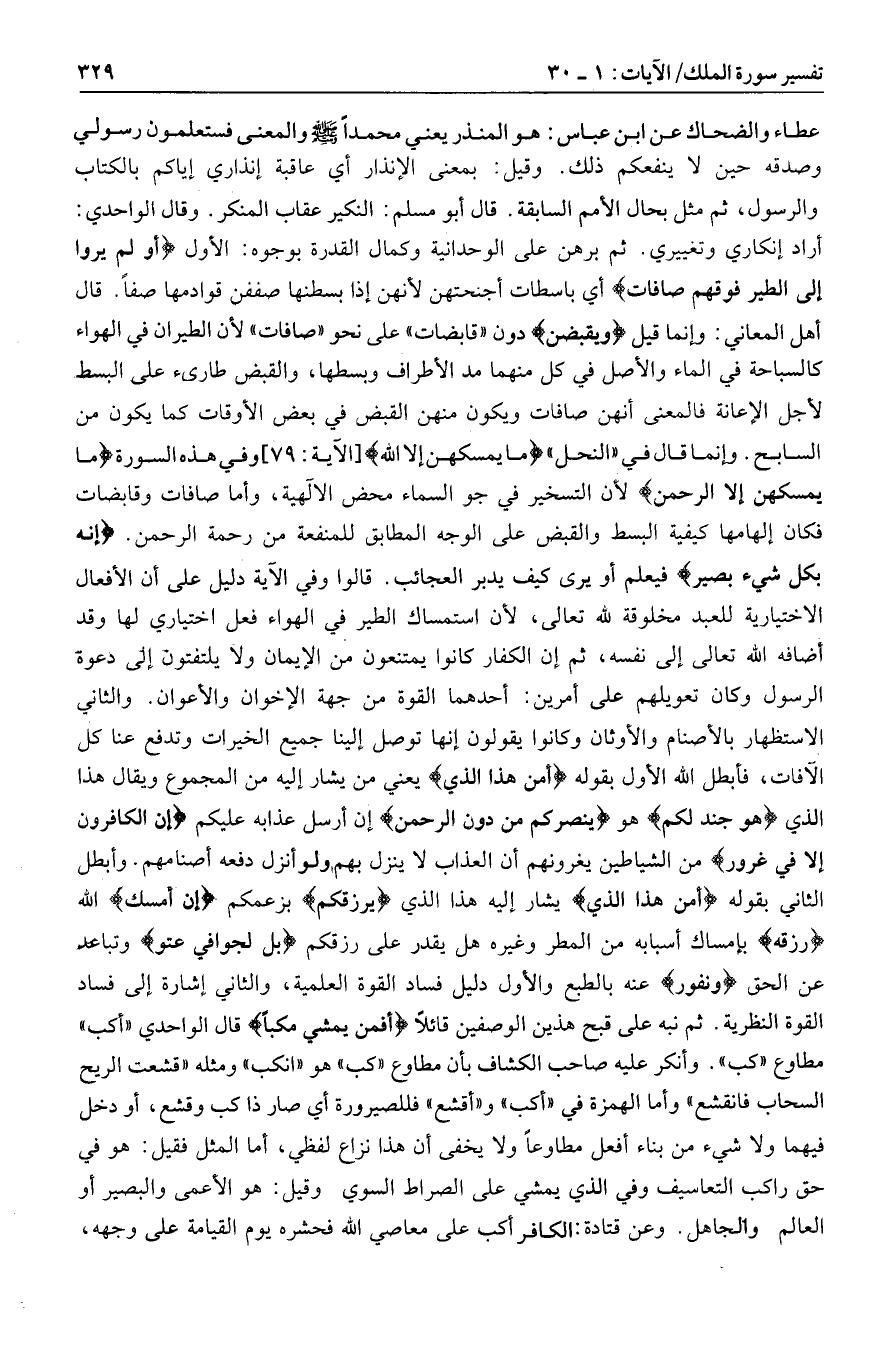أراد إنكاري وتغييري. ثم برهن على الوحدانية وكمال القدرة بوجوه: الأول أَوَلَمْ يَرَوْا إِلَى الطَّيْرِ فَوْقَهُمْ صافَّاتٍ أي باسطات أجنحتهن لأنهن إذا بسطنها صففن قوادمها صفا. قال أهل المعاني: وإنما قيل وَيَقْبِضْنَ دون «قابضات» على نحو «صافات» لأن الطيران في الهواء كالسباحة في الماء والأصل في كل منهما مد الأطراف وبسطها، والقبض طارئ على البسط لأجل الإعانة فالمعنى أنهن صافات ويكون منهن القبض في بعض الأوقات كما يكون من السابح. وإنما قال في «النحل» ما يُمْسِكُهُنَّ إِلَّا اللَّهُ [الآية: 79] وفي هذه السورة ما يُمْسِكُهُنَّ إِلَّا الرَّحْمنُ لأن التسخير في جو السماء محض الإلهية، وأما صافات وقابضات فكان إلهامها كيفية البسط والقبض على الوجه المطابق للمنفعة من رحمة الرحمن. إِنَّهُ بِكُلِّ شَيْءٍ بَصِيرٌ فيعلم أو يرى كيف يدبر العجائب. قالوا وفي الآية دليل على أن الأفعال الاختيارية للعبد مخلوقة لله تعالى، لأن استمساك الطير في الهواء فعل اختياري لها وقد أضافه الله تعالى إلى نفسه، ثم إن الكفار كانوا يمتنعون من الإيمان ولا يلتفتون إلى دعوة الرسول وكان تعويلهم على أمرين: أحدهما القوة من جهة الإخوان والأعوان. والثاني الاستظهار بالأصنام والأوثان وكانوا يقولون إنها توصل إلينا جميع الخيرات وتدفع عنا كل الآفات، فأبطل الله الأول بقوله أَمَّنْ هذَا الَّذِي يعني من يشار إليه من المجموع ويقال هذا الذي هُوَ جُنْدٌ لَكُمْ هو يَنْصُرُكُمْ مِنْ دُونِ الرَّحْمنِ إن أرسل عذابه عليكم إِنِ الْكافِرُونَ إِلَّا فِي غُرُورٍ من الشياطين يغرونهم أن العذاب لا ينزل بهم ولو أنزل دفعه أصنامهم. وأبطل الثاني بقوله أَمَّنْ هذَا الَّذِي يشار إليه هذا الذي يَرْزُقُكُمْ بزعمكم إِنْ أَمْسَكَ الله رِزْقَهُ بإمساك أسبابه من المطر وغيره هل يقدر على رزقكم بَلْ لَجُّوا فِي عُتُوٍّ وتباعد عن الحق وَنُفُورٍ عنه بالطبع والأول دليل فساد القوة العلمية، والثاني إشارة إلى فساد القوة النظرية. ثم نبه على قبح هذين الوصفين قائلا أَفَمَنْ يَمْشِي مُكِبًّا قال الواحدي «أكب» مطاوع «كب» . وأنكر عليه صاحب الكشاف بأن مطاوع «كب» هو «انكب» ومثله «قشعت الريح السحاب فانقشع» وأما الهمزة في «أكب» و «أقشع» فللصيرورة أي صار ذا كب وقشع، أو دخل فيهما ولا شيء من بناء أفعل مطاوعا ولا يخفى أن هذا نزاع لفظي، أما المثل فقيل: هو في حق راكب التعاسيف وفي الذي يمشي على الصراط السوي وقيل: هو الأعمى والبصير أو العالم والجاهل. وعن قتادة: الكافر أكب على معاصي الله فحشره يوم القيامة على وجهه،