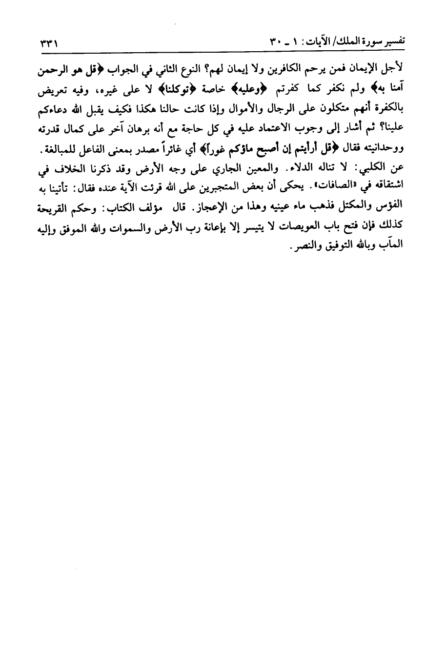 لأجل الإيمان فمن يرحم الكافرين ولا إيمان لهم؟ النوع الثاني في الجواب قُلْ هُوَ الرَّحْمنُ آمَنَّا بِهِ ولم نكفر كما كفرتم وَعَلَيْهِ خاصة تَوَكَّلْنا لا على غيره، وفيه تعريض بالكفرة أنهم متكلون على الرجال والأموال وإذا كانت حالنا هكذا فكيف يقبل الله دعاءكم علينا؟ ثم أشار إلى وجوب الاعتماد عليه في كل حاجة مع أنه برهان آخر على كمال قدرته ووحدانيته فقال قُلْ أَرَأَيْتُمْ إِنْ أَصْبَحَ ماؤُكُمْ غَوْراً أي غائرا مصدر بمعنى الفاعل للمبالغة.
