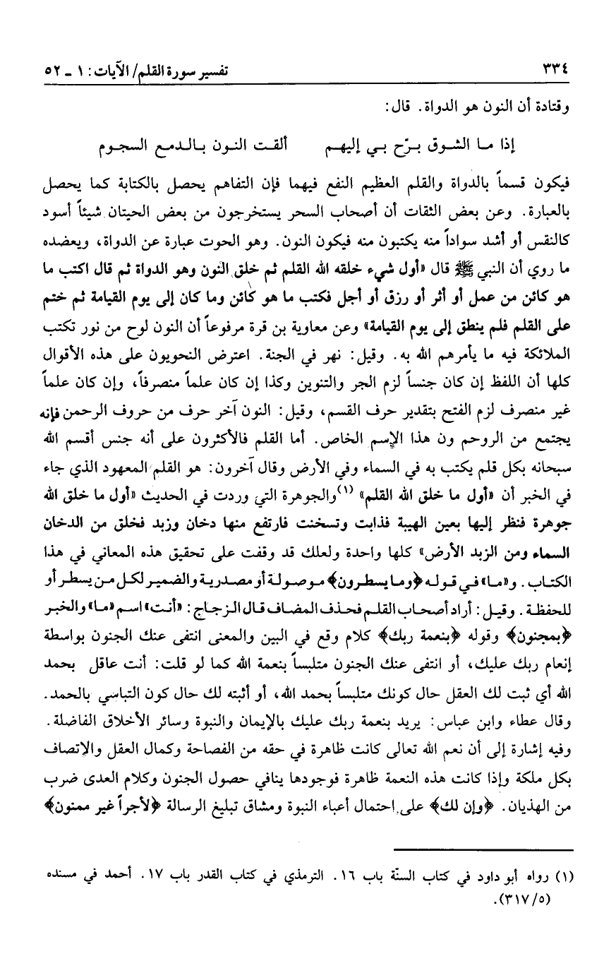 روي أن النبي صلى الله عليه وسلم قال «أول شيء خلقه الله القلم ثم خلق النون وهو الدواة ثم قال اكتب ما هو كائن من عمل أو أثر أو رزق أو أجل فكتب ما هو كائن وما كان إلى يوم القيامة ثم ختم على القلم فلم ينطق إلى يوم القيامة»