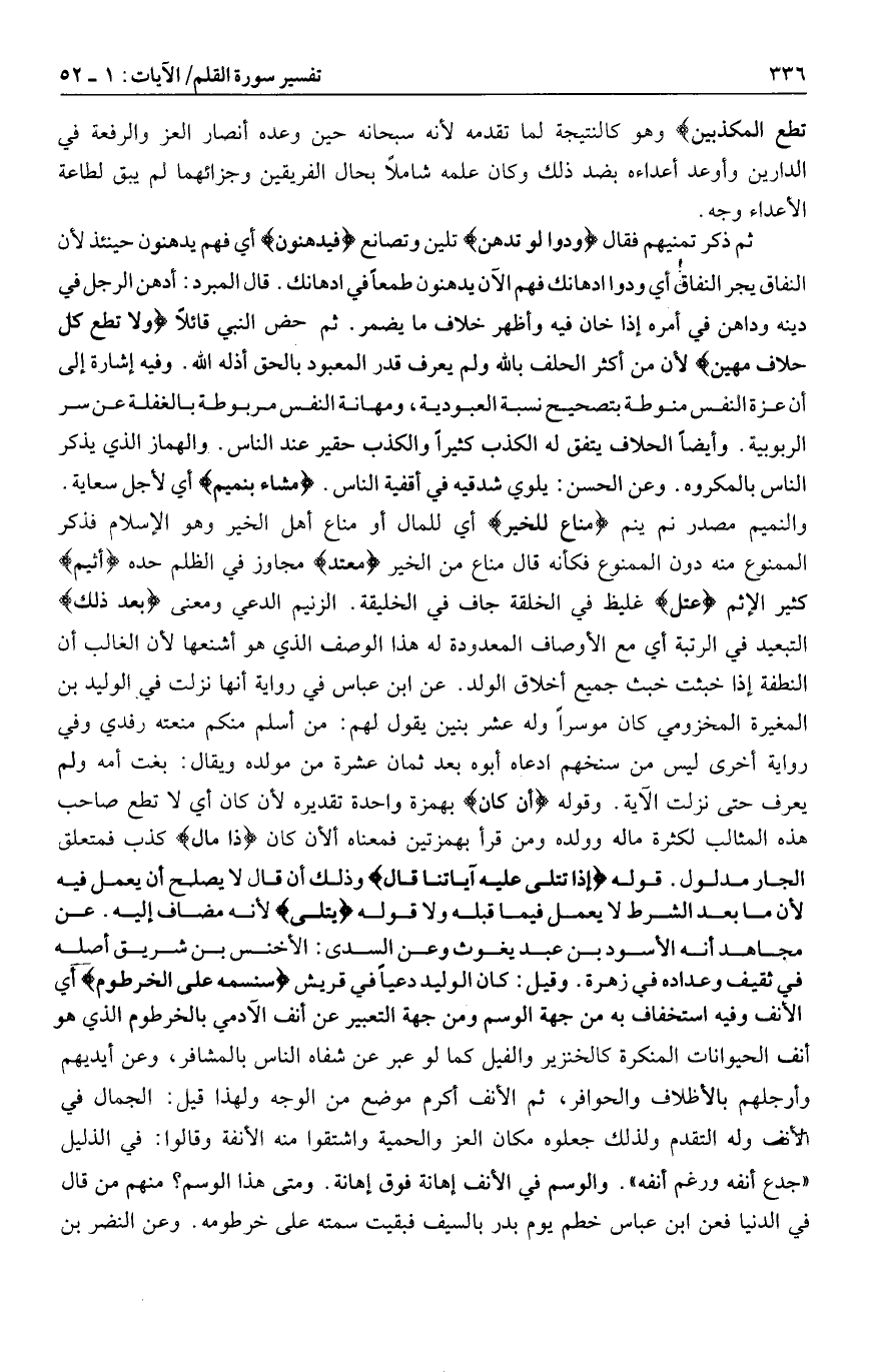 والنميم مصدر نم ينم مَنَّاعٍ لِلْخَيْرِ أي للمال أو مناع أهل الخير وهو الإسلام فذكر الممنوع منه دون الممنوع فكأنه قال مناع من الخير مُعْتَدٍ مجاوز في الظلم حده أَثِيمٍ كثير الإثم عُتُلٍّ غليظ في الخلقة جاف في الخليقة. الزنيم الدعي ومعنى بَعْدَ ذلِكَ التبعيد في الرتبة أي مع الأوصاف المعدودة له هذا الوصف الذي هو أشنعها لأن الغالب أن النطفة إذا خبثت خبث جميع أخلاق الولد. عن ابن عباس في رواية أنها نزلت في الوليد بن المغيرة المخزومي كان موسرا وله عشر بنين يقول لهم: من أسلم منكم منعته رفدي وفي رواية أخرى ليس من سنخهم ادعاه أبوه بعد ثمان عشرة من مولده ويقال: بغت أمه ولم يعرف حتى نزلت الآية. وقوله أَنْ كانَ بهمزة واحدة تقديره لأن كان أي لا تطع صاحب هذه المثالب لكثرة ماله وولده ومن قرأ بهمزتين فمعناه ألأن كان ذا مالٍ كذب فمتعلق الجار مدلول. قوله إِذا تُتْلى عَلَيْهِ آياتُنا قالَ وذلك أن قال لا يصلح أن يعمل فيه لأن ما بعد الشرط لا يعمل فيما قبله ولا قوله يتلى لأنه مضاف إليه. عن مجاهد أنه الأسود بن عبد يغوث وعن السدى: الأخنس بن شريق أصله في ثقيف وعداده في زهرة. وقيل: كان الوليد دعيا في قريش سَنَسِمُهُ عَلَى الْخُرْطُومِ أي الأنف وفيه استخفاف به من جهة الوسم ومن جهة التعبير عن أنف الآدمي بالخرطوم الذي هو أنف الحيوانات المنكرة كالخنزير والفيل كما لو عبر عن شفاه الناس بالمشافر، وعن أيديهم وأرجلهم بالأظلاف والحوافر، ثم الأنف أكرم موضع من الوجه ولهذا قيل: الجمال في الأنف وله التقدم ولذلك جعلوه مكان العز والحمية واشتقوا منه الأنفة وقالوا: في الذليل «جدع أنفه ورغم أنفه» . والوسم في الأنف إهانة فوق إهانة. ومتى هذا الوسم؟ منهم من قال في الدنيا فعن ابن عباس خطم يوم بدر بالسيف فبقيت سمته على خرطومه. وعن النضر بن