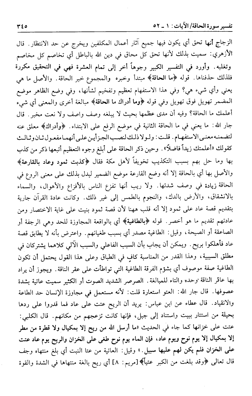 الزجاج أنها تحق أي يكون فيها جميع آثار أعمال المكلفين ويخرج عن حد الانتظار. قال الأزهري: سميت بذلك لأنها تحق كل محاق في دين الله بالباطل أي تخاصم كل مخاصم وتغلبه. وأورد في التفسير الكبير وجوها أخر إلى تمام العشرة فهي في التحقيق مكررة فلذلك حذفناها. قوله مَا الْحَاقَّةُ مبتدأ وخبره والمجموع خبر الحاقة. والأصل ما هي يعني وأي شيء هي؟ وفي هذا الاستفهام تعظيم وتفخيم لشأنها، وفي وضع الظاهر موضع المضمر تهويل فوق تهويل وفي قوله وَما أَدْراكَ مَا الْحَاقَّةُ مبالغة أخرى والمعنى أي شيء أعلمك ما الحاقة؟ وفيه أن مدى عظمها بحيث لا يبلغه وصف واصف ولا نعت مخبر. قال جار الله: ما يعني في ما الحاقة الثانية في موضع الرفع على الابتداء. وأَدْراكَ معلق عنه لتضمنه معنى الاستفهام. قلت: ولولا ذلك لنصب الجزأين على أنهما مفعول ثان وثالث كقولك «أعلمتك زيدا فاضلا» . وحين ذكر الحاقة على أبلغ وجوه التعظيم أتبعها ذكر من كذب بها وما حل بهم بسبب التكذيب تخويفا لأهل مكة فقال كَذَّبَتْ ثَمُودُ وَعادٌ بِالْقارِعَةِ والأصل بها أي بالحاقة إلا أنه وضع القارعة موضع الضمير ليدل بذلك على معنى الروع في الحاقة زيادة في وصف شدتها. ولا ريب أنها تفزع الناس بالأفزاع والأهوال، والسماء بالانشقاق، والأرض بالدك، والنجوم بالطمس إلى غير ذلك. وكانت عادة القرآن جارية بتقديم قصة عاد على ثمود إلا أنه قلب هاهنا لأن قصة ثمود بنيت على غاية الاختصار ومن عادتهم تقديم ما هو أخصر. قوله بِالطَّاغِيَةِ أي بالواقعة المجاوزة للحد وهي الرجفة أو الصاعقة أو الصيحة، وقيل: الطاغية مصدر أي بسبب طغيانهم. واعترض بأنه لا يطابق قصة عاد فأهلكوا بريح. ويمكن أن يجاب بأن السبب الفاعلي والسبب الآلي كلاهما يشتركان في مطلق السببية، وهذا القدر من المناسبة كاف في الطباق وعلى هذا القول يحتمل أن تكون الطاغية صفة موصوف أي بشؤم الفرقة الطاغية التي تواطأت على عقر الناقة. ويجوز أن يراد بها عاقر الناقة وحده والتاء للمبالغة. الصرصر الشديد الصوت أو الكثير سميت عاتية بشدة عصوفها. قال جار الله: العتو استعارة قلت: لأنه مستعمل في مجاوزة الإنسان حد الطاعة والانقياد. قال عطاء عن ابن عباس: يريد أن الريح عتت على عاد فما قدروا على ردها بحيلة من استتار ببيت واستناد إلى جبل، فإنها كانت تزعجهم من مكانهم. قال الكلبي: