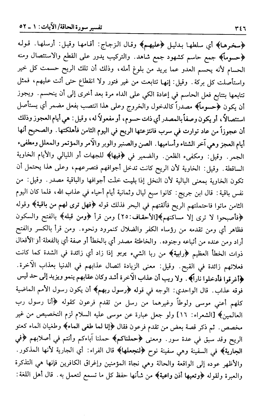 سَخَّرَها أي سلطها بدليل عَلَيْهِمْ وقال الزجاج: أقامها وقيل: أرسلها. قوله حُسُوماً جمع حاسم كشهود جمع شاهد. والتركيب يدور على القطع والاستئصال ومنه الحسام لأنه يحسم العدو عما يريد من بلوغ أمله، وذلك أن تلك الريح حسمت كل خير واستأصلت كل بركة. وقيل: إنها تتابعت من غير فتور ولا انقطاع حتى أتت عليهم، فمثل تتابعها بتتابع فعل الحاسم في إعادة الكي على الداء مرة بعد أخرى إلى أن ينحسم. ويجوز أن يكون حُسُوماً مصدرا كالدخول والخروج وعلى هذا انتصب بفعل مضمر أي يستأصل استئصالا، أو يكون وصفا بالمصدر أي ذات حسوم، أو مفعولا له، وقيل: هي أيام العجوز وذلك أن عجوزا من عاد توارت في سرب فانتزعتها الريح في اليوم الثامن فأهلكتها. والصحيح أنها أيام العجز وهي آخر الشتاء وأساميها. الصن والصنبر والوبر والآمر والمؤتمر والمعلل ومطفىء الجمر. وقيل: ومكفىء الظعن. والضمير في فِيها للجهات أو الليالي والأيام الخاوية الساقطة. وقيل: الخاوية لأن الريح كانت تدخل أجوافهم فتصرعهم، وعلى هذا يحتمل أن تكون الخاوية بمعنى البالية لأن النخل إذا بليت خلت أجوافها والباقية مصدر. وقيل: من نفس باقية: قال ابن جريج: كانوا سبع ليال وثمانية أيام أحياء في عذاب الله، فلما كان اليوم الثامن ماتوا فاحتملتهم الريح فألقتهم في البحر فذلك قوله فَهَلْ تَرى لَهُمْ مِنْ باقِيَةٍ وقوله فأصبحوا لا ترى إلا مساكنهم [الأحقاف: 25] ومن قرأ وَمَنْ قَبْلَهُ بالفتح والسكون فظاهر أي ومن تقدمه من رؤساء الكفر والضلال كنمرود ونحوه. ومن قرأ بالكسر والفتح أراد ومن عنده من أتباعه وجنوده. والخاطئة مصدر أي بالخطأ أو صفة أي بالفعلة أو الأفعال ذوات الخطأ العظيم رابِيَةً من ربا الشيء يربو إذا زاد أي زائدة في الشدة كما كانت فعلاتهم زائدة في القبح. وقيل: معنى الزيادة اتصال عذابهم في الدنيا بعذاب الآخرة.