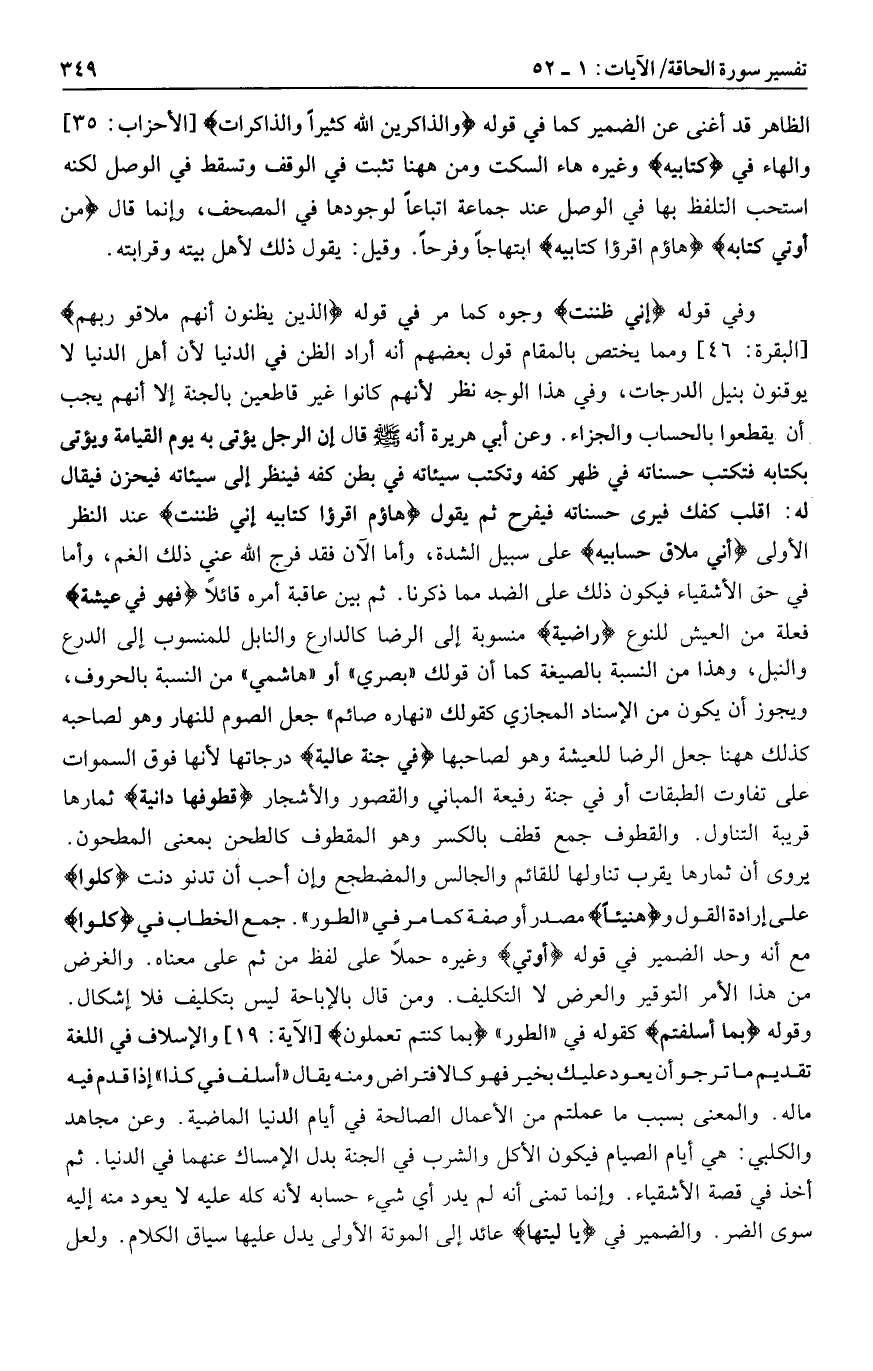 الظاهر قد أغنى عن الضمير كما في قوله وَالذَّاكِرِينَ اللَّهَ كَثِيراً وَالذَّاكِراتِ [الأحزاب: 35] والهاء في كِتابِيَهْ وغيره هاء السكت ومن هاهنا تثبت في الوقف وتسقط في الوصل لكنه استحب التلفظ بها في الوصل عند جماعة اتباعا لوجودها في المصحف، وإنما قال مَنْ أُوتِيَ كِتابَهُ هاؤُمُ اقْرَؤُا كِتابِيَهْ ابتهاجا وفرحا. وقيل: يقول ذلك لأهل بيته وقرابته.