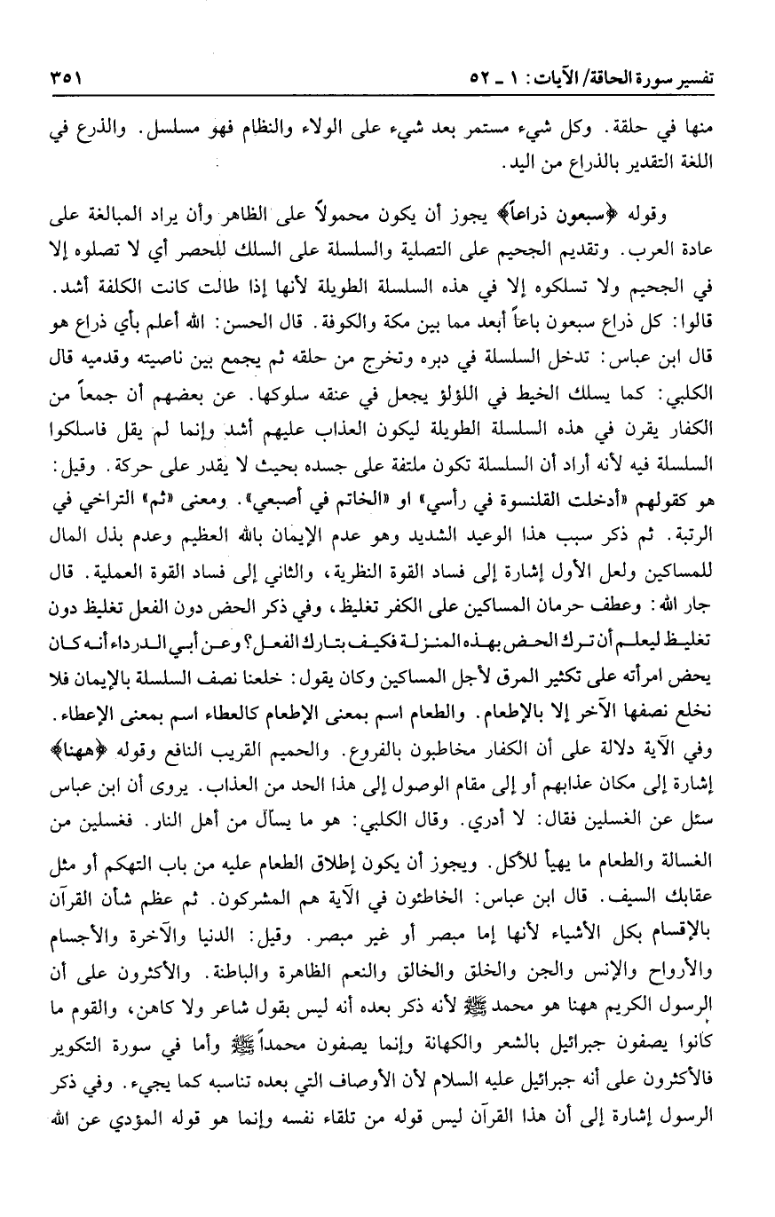 هو كقولهم «أدخلت القلنسوة في رأسي» او «الخاتم في أصبعي» . ومعنى «ثم» التراخي في الرتبة. ثم ذكر سبب هذا الوعيد الشديد وهو عدم الإيمان بالله العظيم وعدم بذل المال للمساكين ولعل الأول إشارة إلى فساد القوة النظرية، والثاني إلى فساد القوة العملية. قال جار الله: وعطف حرمان المساكين على الكفر تغليظ، وفي ذكر الحض دون الفعل تغليظ دون تغليظ ليعلم أن ترك الحض بهذه المنزلة فكيف بتارك الفعل؟ وعن أبي الدرداء أنه كان يحض امرأته على تكثير المرق لأجل المساكين وكان يقول: خلعنا نصف السلسلة بالإيمان فلا نخلع نصفها الآخر إلا بالإطعام. والطعام اسم بمعنى الإطعام كالعطاء اسم بمعنى الإعطاء.